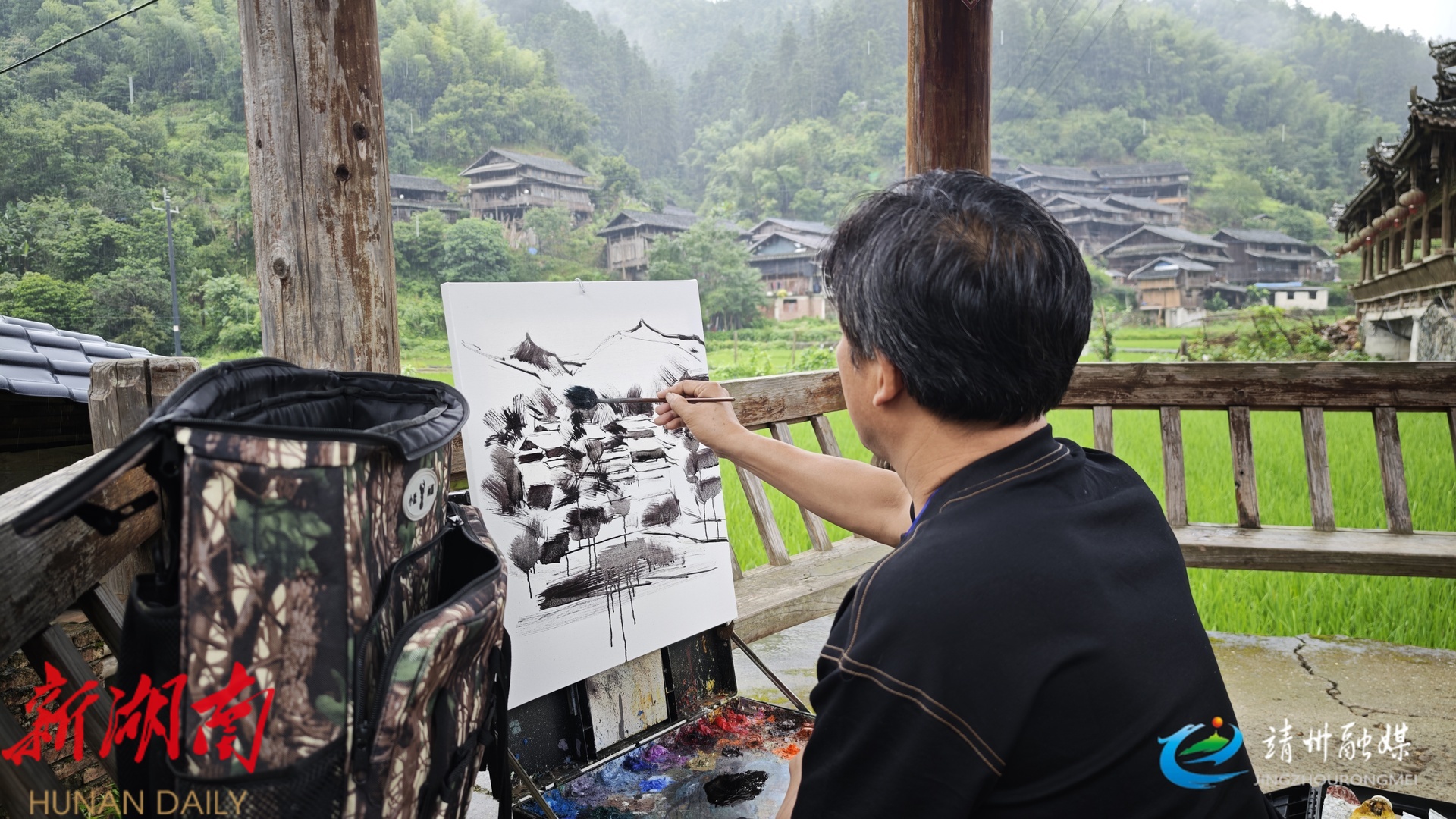 艺术家运用油画专注描绘古朴的吊脚楼(胡耀文 摄)