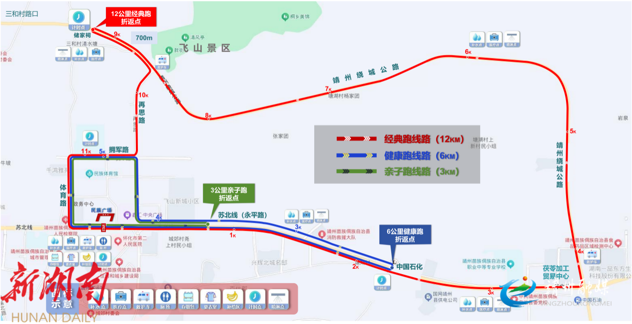 本次赛事路线途径民族广场、茯苓加工贸易中心、飞山景区大门、再思路、拥军路等地,将靖州独特的自然风光与人文底蕴充分展现。赛事设经典跑(全程约12公里)、健康跑(全程约6公里)、亲子跑(全程约3公里)三大竞赛项目,让跑者以脚步丈量城市,沉浸式感受靖州魅力。