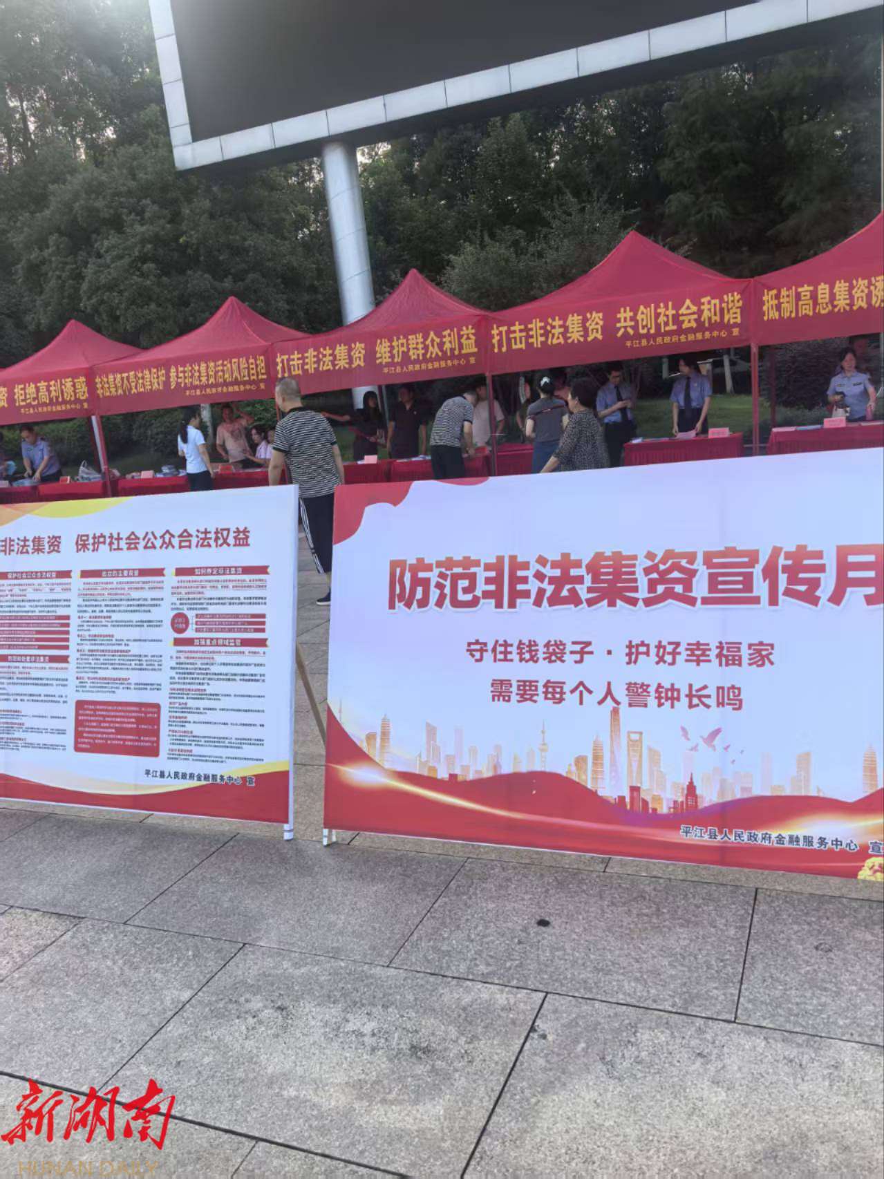 平江融媒6月25日讯(通讯员 欧阳莎)为进一步提升社会公众对非法集资的识别防范能力,切实守护好人民群众的“钱袋子”,6月25日傍晚,平江县在天岳广场成功举办“守住钱袋子·护好幸福家”防范非法集资集中宣传日活动。本次活动由县政府金融服务中心牵头,金融监管局平江支局、中国人民银行平江营业管理部、县公安局、县法院、县检察院、县市场监督管理局、县民政局、县发改局以及多家银行、保险机构等20家单位共同参与。