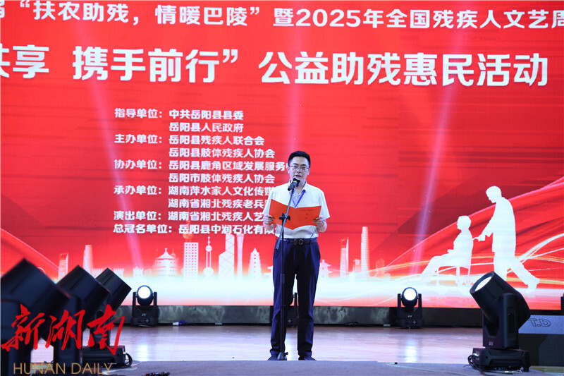 湖南日报·新湖南客户端6月30日讯(通讯员 尹宇豪) 6月28日晚,由县残疾人联合会、县肢体残疾人协会联合主办的2025年全国残疾人文化周暨岳阳县第二届“扶农助残”公益助残惠民明星演唱会在岳阳县一中体育馆隆重举行,副县长张文毅出席活动并致辞。