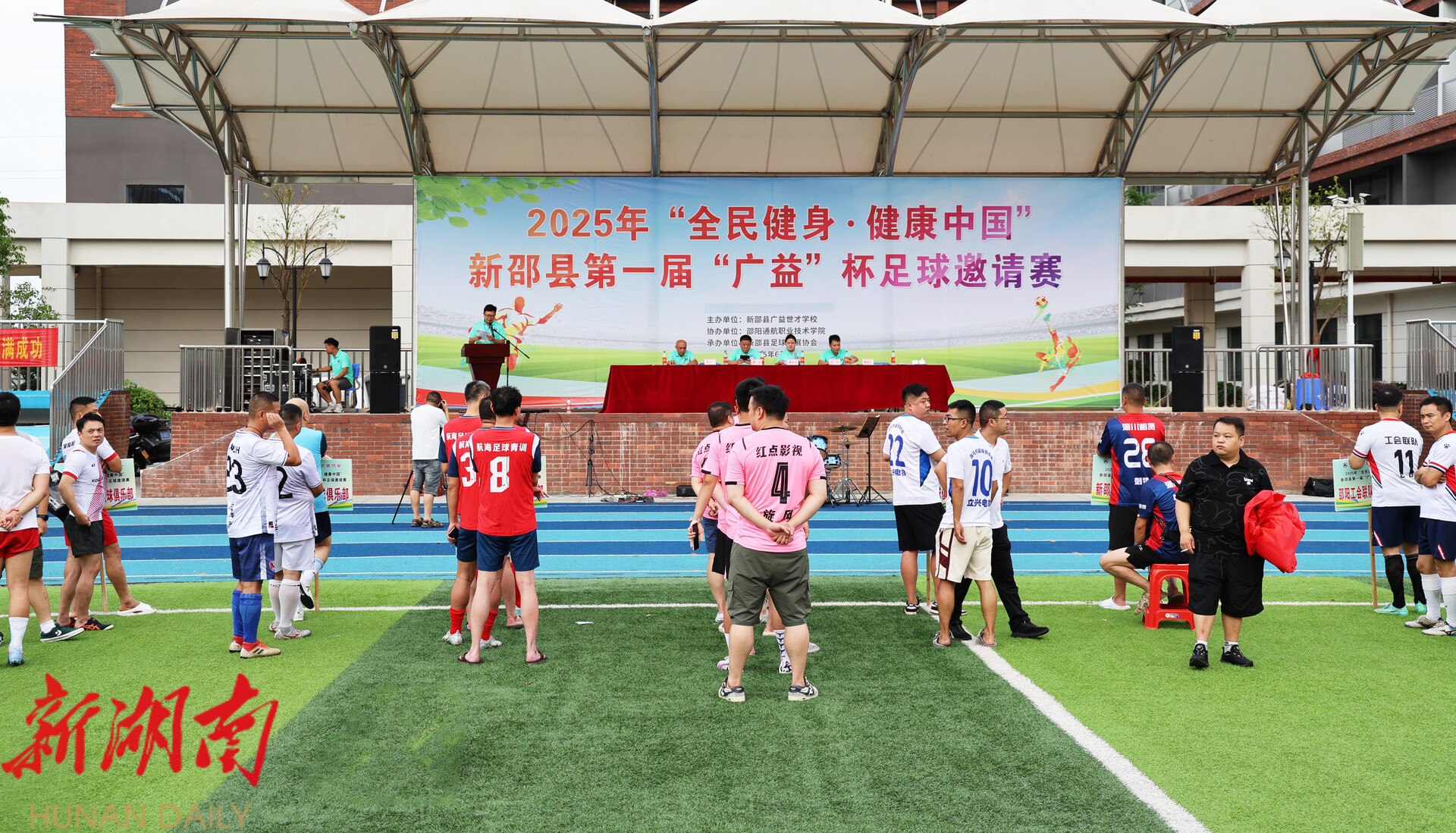 新新邵客户端6月29日讯(记者 石银子 何雯 赵少波) 6月28日,由新邵县广益世才学校主办、邵阳通航职业技术学院协办、新邵县足球发展协会承办的2025年“全民健身·健康中国”新邵县第一届“广益”杯足球邀请赛,在邵阳通航职业技术学院鸣哨开赛。
