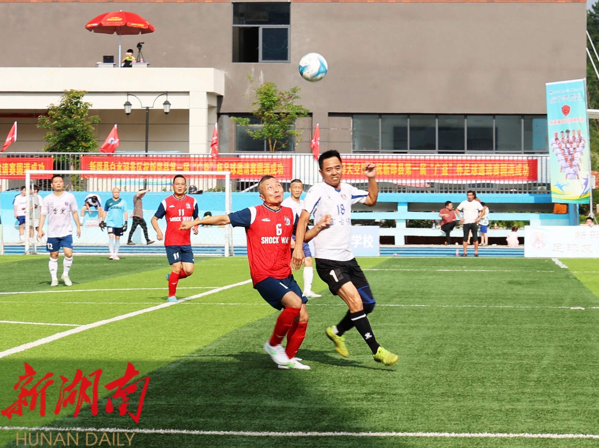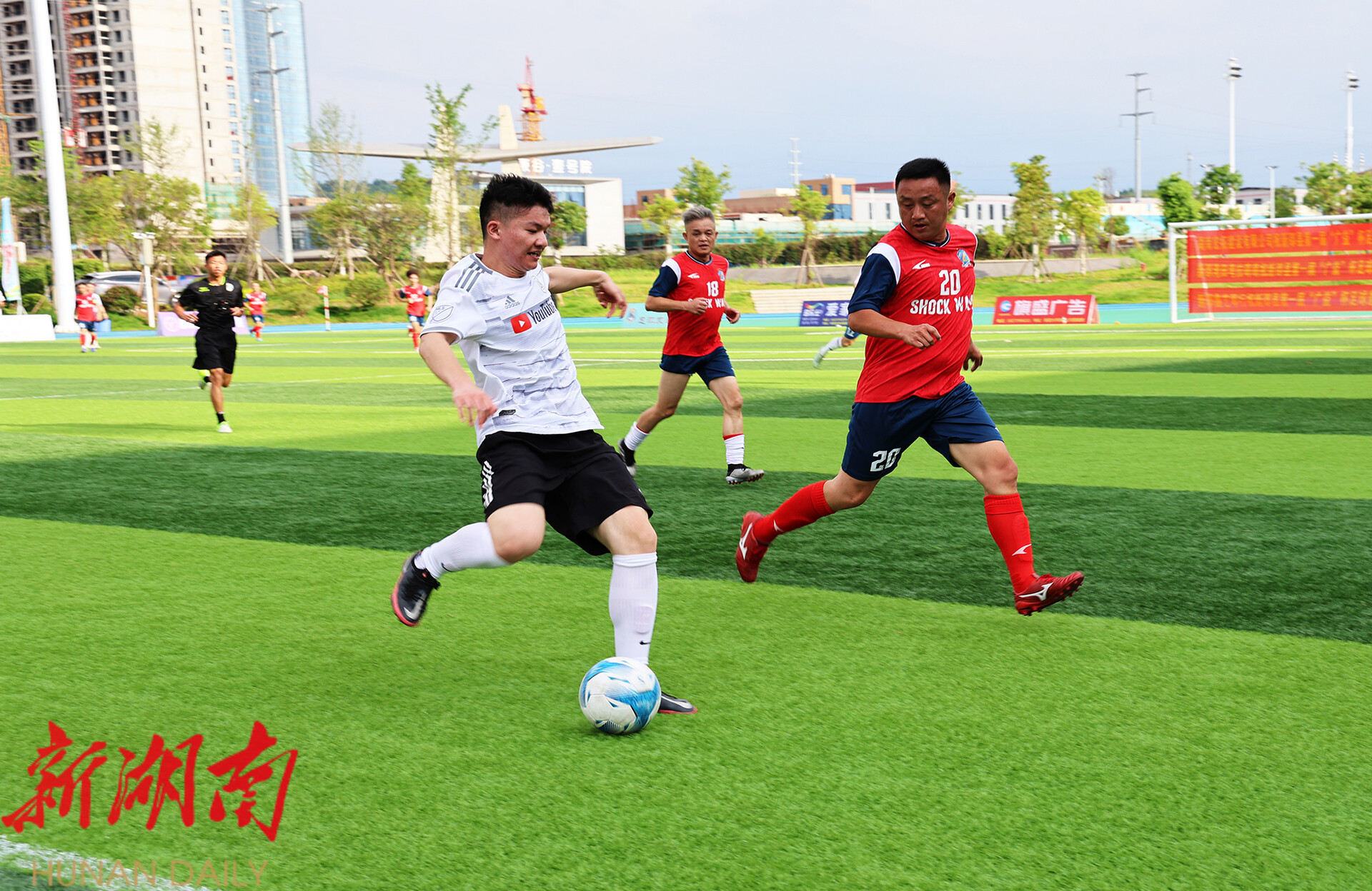 当天下午,简短的开幕仪式结束后,比赛正式开始。流畅的盘带、精彩的配合、巧妙的过人、犀利的射门……球场上,参赛选手们不畏高温酷热,在绿茵场上演绎着一场场速度与激情,尽情挥洒着汗水与热爱。此次比赛时间为6月28日至7月23日,每周三、周六举行,共有来自邵阳市各县市区的12支代表队参加。