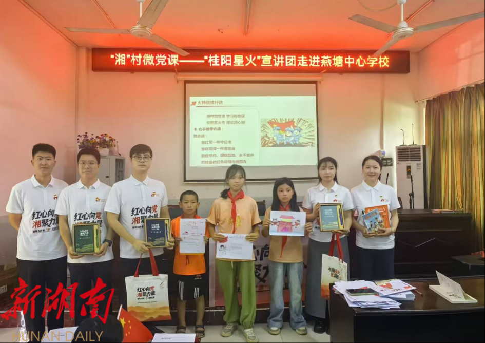 新桂阳7月1日讯(通讯员 杨壮壮 邓雷 李泽人 李文杰 高崇善 卢军 ) 湖南是一片红色热土,桂阳县更是一座“红色文化宝库”。为推动桂阳红色文化传承、宣介乡村振兴经验,桂阳县2023届、2024届6名选调生组建了“桂阳星火”宣讲团。宣讲团深入桂阳县方元镇、莲塘镇、荷叶镇、正和镇、欧阳海镇等乡镇,依托党支部“一月一课一片一实践”载体,充分发挥“党支部+学校”的协同育人作用,通过沉浸式红色故事宣讲、代入式创意互动、现身式乡村振兴案例分享,面向在校学生和支部党员开展“湘”村微党课宣讲,助力青少年厚植家国情怀,增强基层党员乡村振兴的责任意识。
