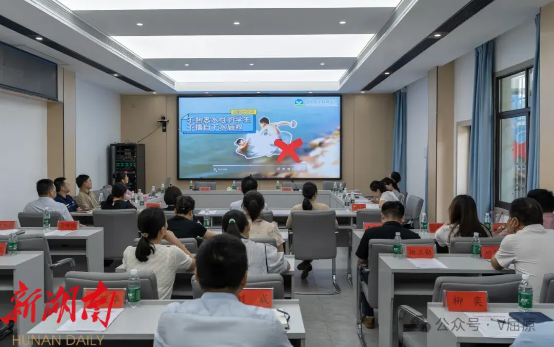 会议首先组织观看了2025年中小学生防溺水安全教育警示片。随后,区教体局负责人传达学习了《湖南省预防中小学生溺水若干规定》条款要求和上级会议精神,明确了责任分工与预防重点。