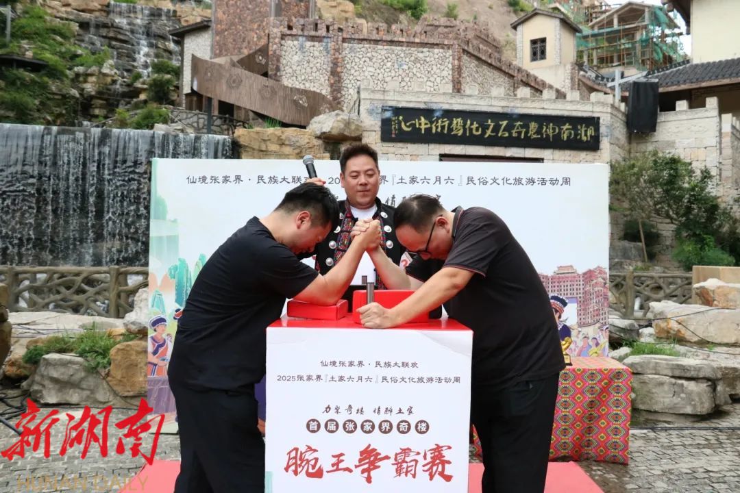 与此同时,《晒互动》首届张家界“奇楼腕王”争霸赛也在激烈进行。活动现场的“斗腕”擂台周围围满了观众,选手们来自不同年龄和职业,有健身达人,也有普通游客 ,大家都为了“腕王”的荣誉全力以赴。一位参赛选手感慨道:“虽然比赛很紧张,但能在这么有氛围的活动中参赛,还结识了很多志同道合的朋友,值了!”