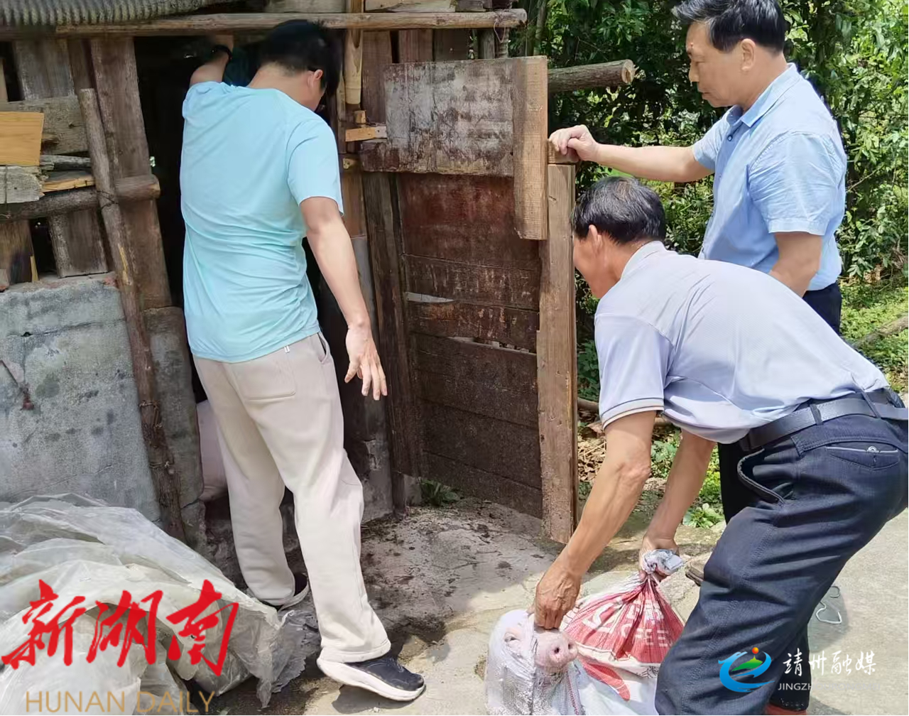 坳上镇乡村两级干部上门为戈盈村监测户杨进明送猪苗(张书钊 供图)
