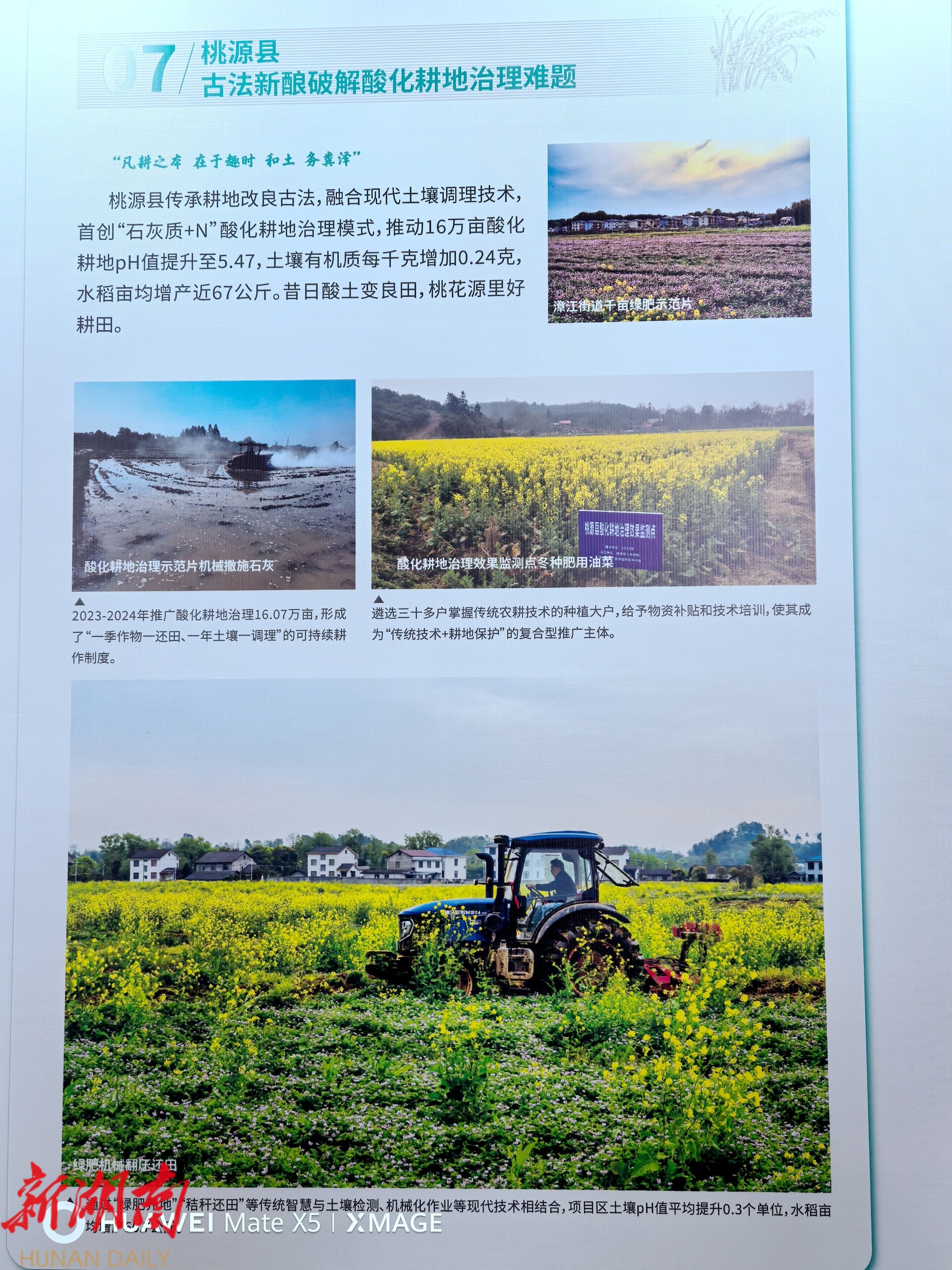 据悉,桃源县既是全国产粮大县,也是全国酸化耕地治理重点县。2023年以来,桃源县传承耕地改良古法,深挖农耕文化中“种养结合、用地养地”智慧内核,融合现代土壤调理技术,首创“石灰质+N”酸化耕地治理模式,推动项目区8万亩酸化耕地pH 值从治理前的5.17提升至5.47,土壤有机质含量每千克增加0.27克,碱解氮、速效钾等养分含量平均提升30%以上,水稻亩均增产近67公斤。古法新酿的桃源智慧,既有力破解了南方酸化耕地治理难题,又成功把“桃花源里好耕田”的美好愿景变为生动现实。