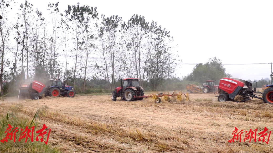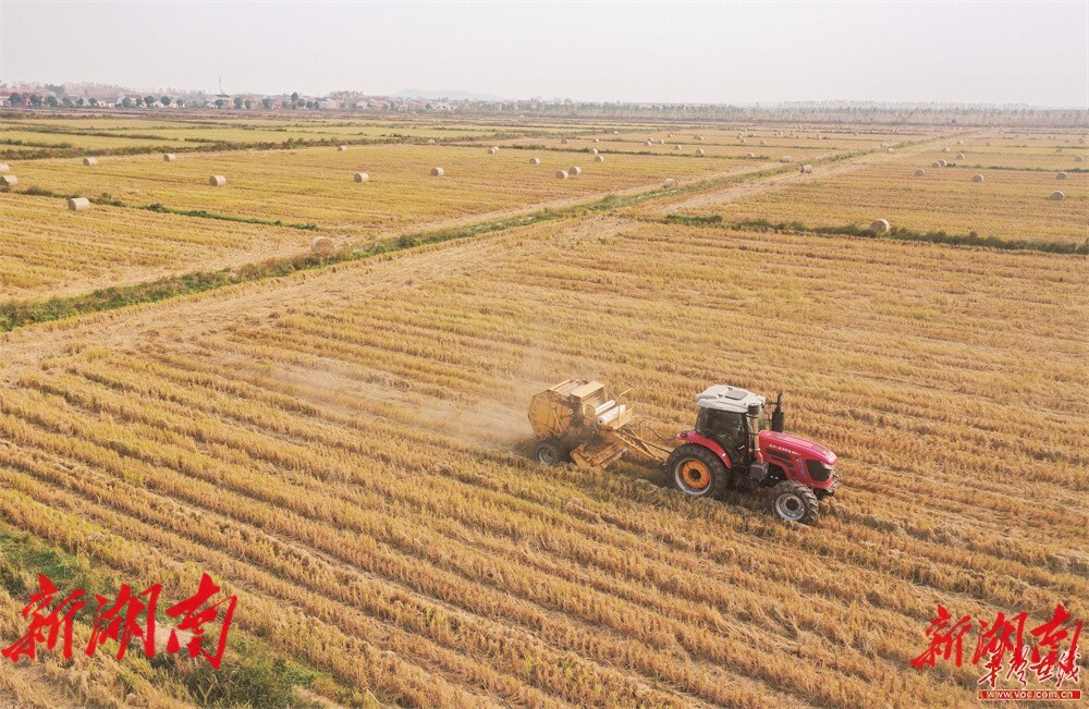 (岳阳市屈原管理区凤凰乡,专业秸秆回收机将田间秸秆统一收集,打捆成垛)
