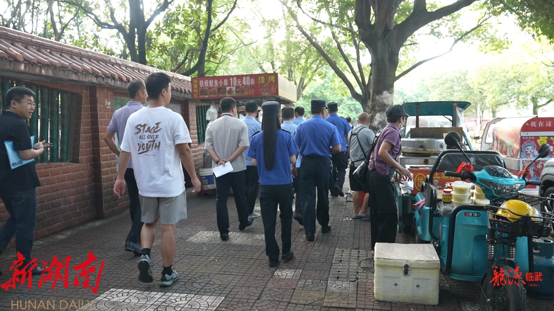 在临武六中校门口,县市场监督管理局的执法人员仔细查看每个摊贩的健康证,询问进货渠道,并认真记录相关信息;县城管局的工作人员则对摊贩的摆摊位置进行规范引导,劝导摊贩前往指定区域经营,并向摊贩宣传食品安全知识,引导他们合法合规经营。