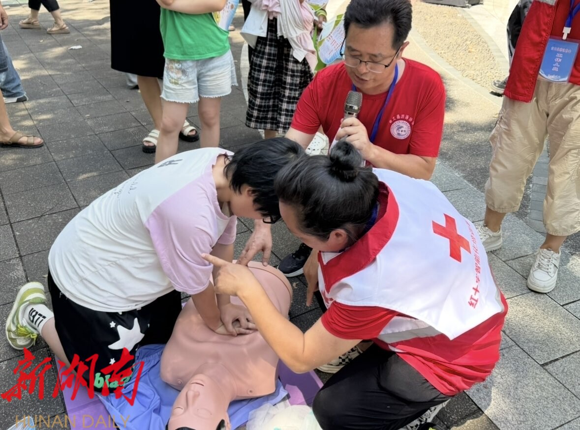 消防队员演示了溺水时的自救技巧,讲解如何在水中保持冷静、借助浮力漂浮等待救援,还让部分学生上台实操体验。古丈县红十字曙光志愿服务队也进行了心肺复苏等急救演练,详细讲解操作要点并现场示范,随后邀请学生上前练习。