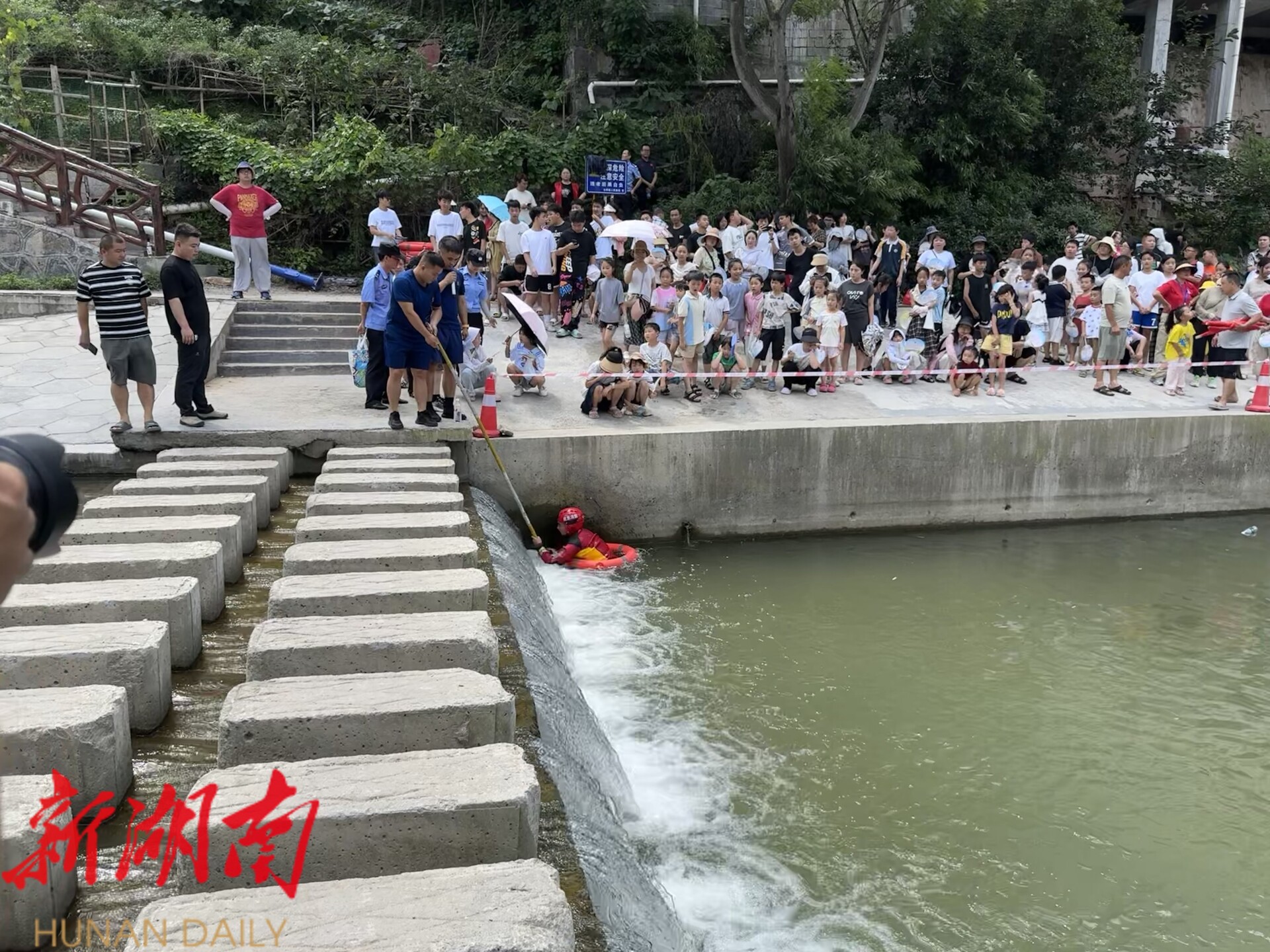 新湖南客户端7月3日讯(通讯员 刘玥 胡婧玥)为切实提升青少年防溺水安全意识和自救互救能力,7月3日下午,湘西土家族苗族自治州古丈县古阳镇在辖区内古阳河边开展防溺水安全演练活动,镇村(社区)干部、检察干警、消防队员及辖区中小学生等近150人参加。