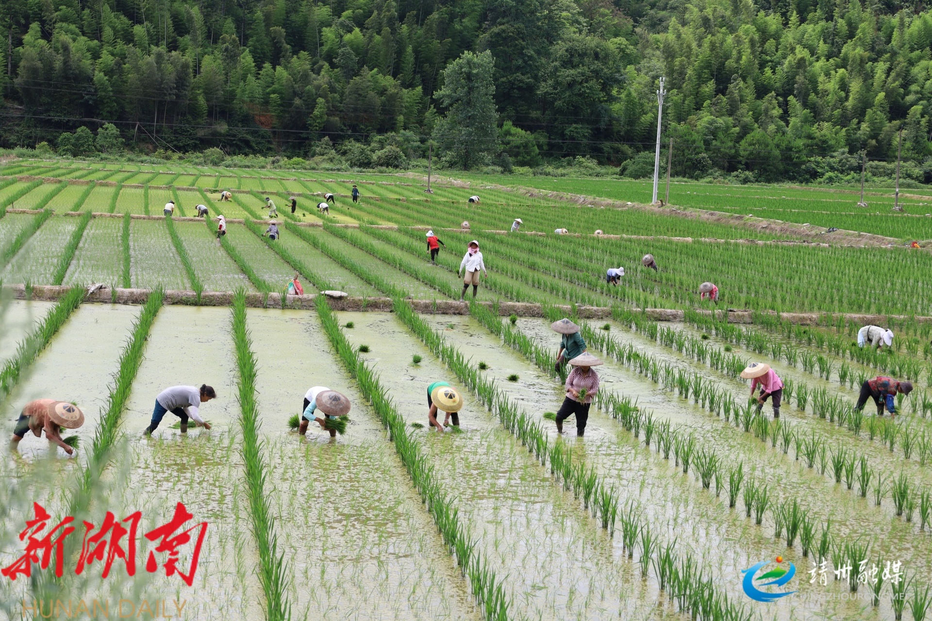 靖州融媒7月4日讯 (通讯员 彭英 杨雨 胡月) 7月2日,盛夏的靖州苗族侗族自治县寨牙乡岩脚村,一片片高标准农田绿意盎然,秧苗随风摇曳。几十位村民正忙着进行杂交水稻人工栽秧,奏响夏日繁忙乐章。