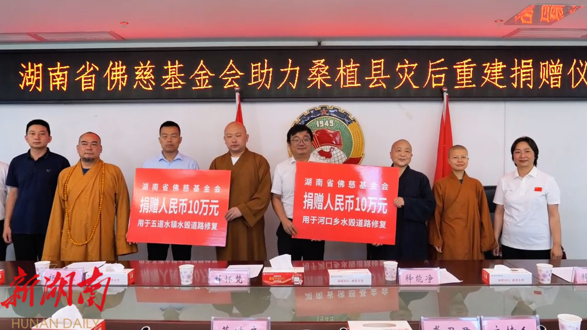 捐赠现场,湖南省佛慈基金会向“6·18”洪灾中基础设施损毁严重的五道水镇、河口乡分别捐赠善款10万元,专项用于水毁道路修复工程。表示希望以这次捐款为媒介,把省佛慈基金会的深情厚谊传达给广大受灾群众,助力桑植县增强战胜灾难的信心。