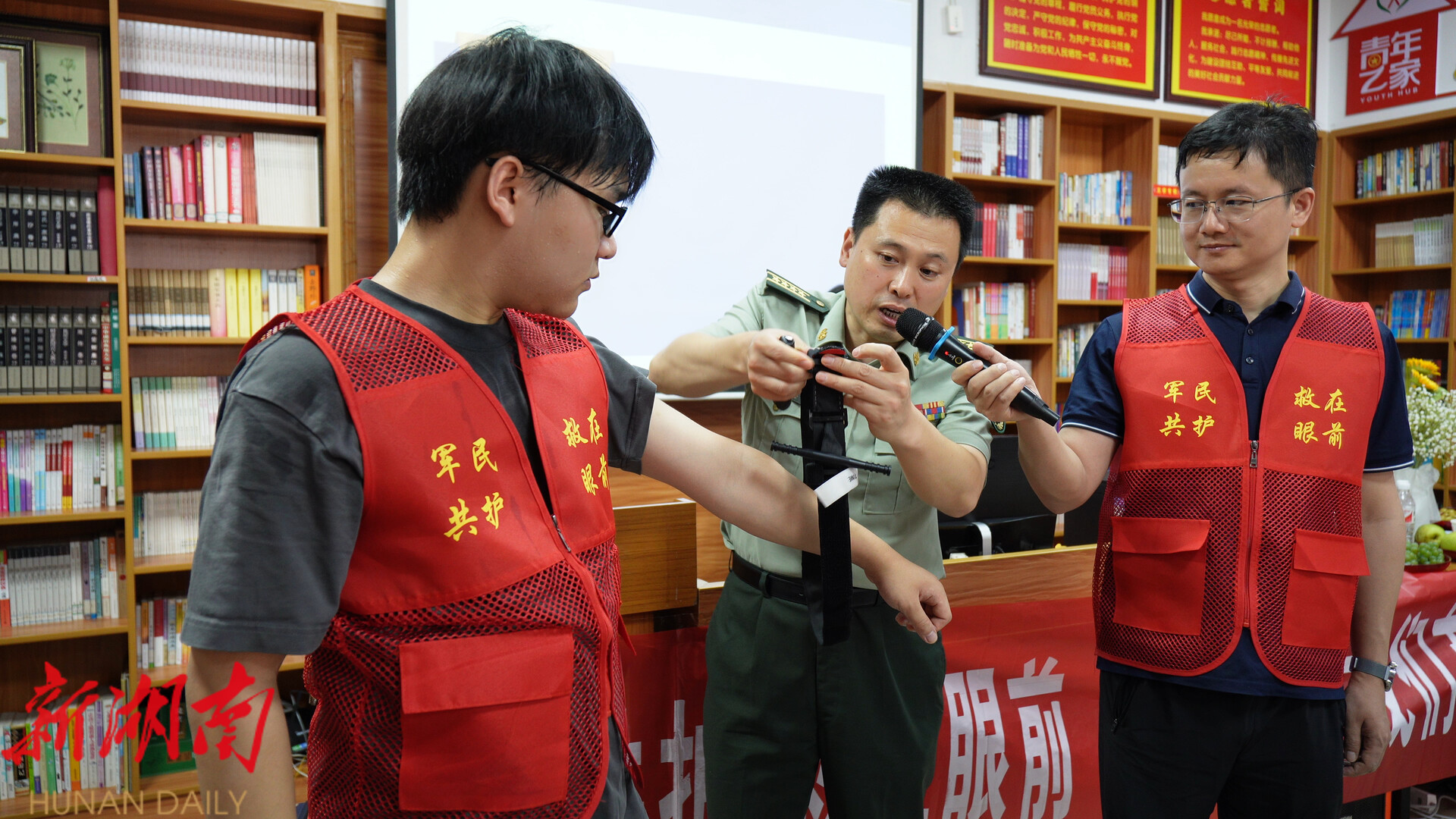 培训现场,国防科技大学宋殿义副教授及其团队廖鑫老师、黄轼豪老师现场教学了止血带的使用方法和注意事项,并结合案例,演示了紧急情况下如何快速止血,随后,宋殿义副教授团队通过AI、AR、VR等技术,清晰明了的将心肺复苏的原理和规范操作流程展现出来,学员们听的聚精会神,并现场进行模拟演练。