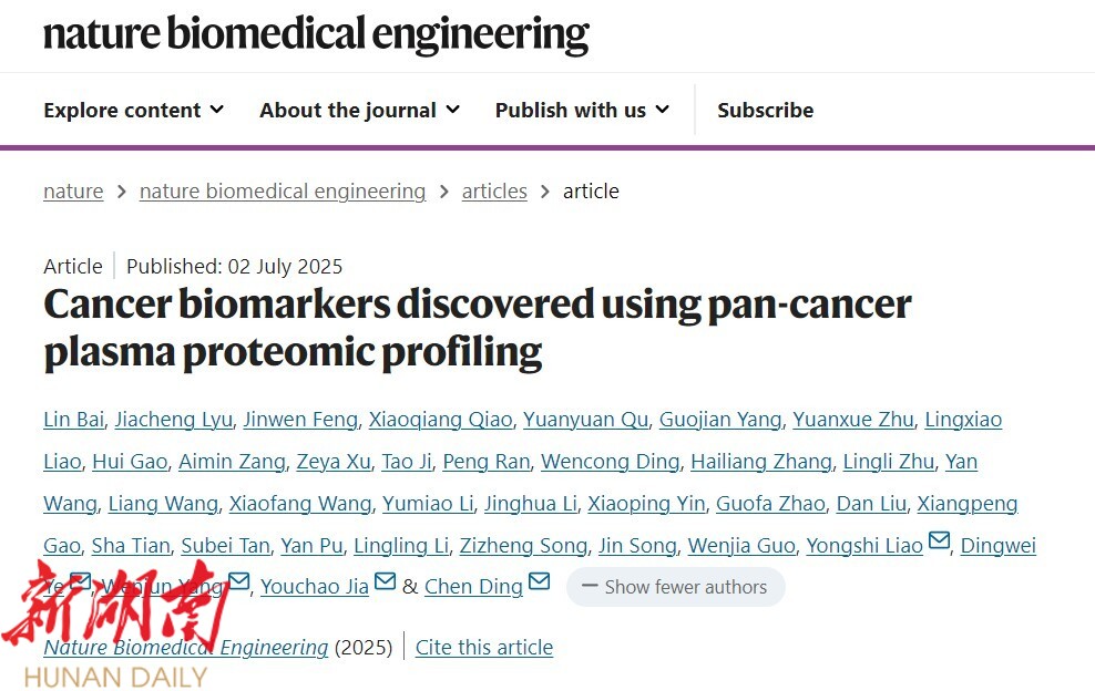 衡东融媒7月6日讯(通讯员 李易珍 周珍 陈媛 陈染羲)近日,南华大学附属南华医院廖勇仕教授参与的跨机构研究团队,在癌症精准诊疗领域取得重大突破。该团队由复旦大学丁琛教授领衔,联合河北大学附属肿瘤医院、上海新华医院、复旦大学附属肿瘤医院及南华医院共同开展研究,相关成果发表于国际权威期刊《Nature Biomedical Engineering》(IF:26.6)。