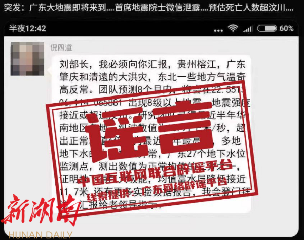 辟谣:网传院士预测广东将发生8级以上大地震?谣言!已报警