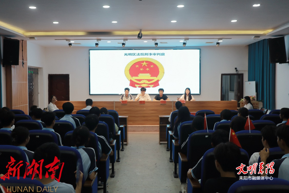 耒阳融媒7月8日讯(记者 梁斌 通讯员 何佳值) 近日,耒阳市选调生宣讲团在耒阳市耒师德纳高中开展“青春心向党 法治护未来”“湘”村微党课活动,以模拟法庭和红色宣讲的形式向该校高二年级全体学生带来了一堂沉浸式思政课。