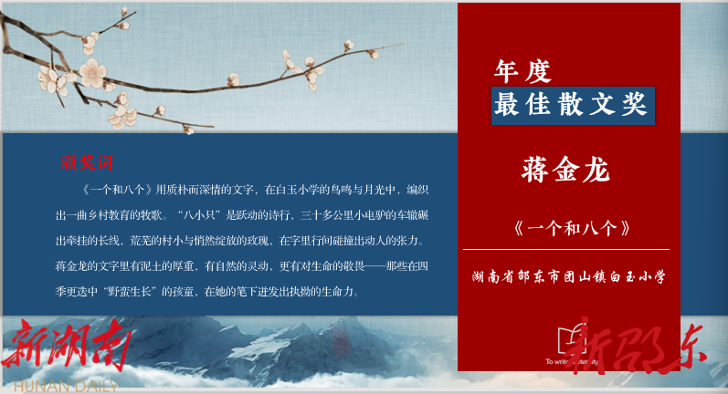 蒋金龙,笔名龙儿,女,现为邵东市团山中学教师,2021年9月至2024年8月任教于团山镇白玉小学。蒋金龙系湖南省教师作家高级研修班学员、中国诗歌学会会员、湖南省作家协会会员、湖南省作家协会教师作家分会会员、邵东市诗歌学会副会长、邵东市诗词协会副会长兼秘书长。有小说、散文、诗歌、诗词散见于《诗刊》《爱你 · 教师文学》《中华辞赋》《湘江文艺》《湖南文学》《诗潮》等刊物。其获奖作品《一个和八个》原发于《爱你》2024年第一期“重磅”栏目。文章用质朴而深情的文字,在白玉小学的鸟鸣与月光中,编织出一曲乡村教育的牧歌。蒋金龙的文字里有泥土的厚重,有自然的灵动,更有对生命的敬畏——那些在四季更迭中“野蛮生长”的孩童,在她的笔下迸发出执拗的生命力。