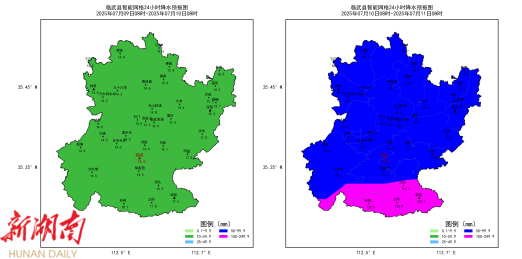 图2 7月9日08时至10日08时临武县降雨量预报图 图3 10日08时至11日08时临武县降雨量预报图