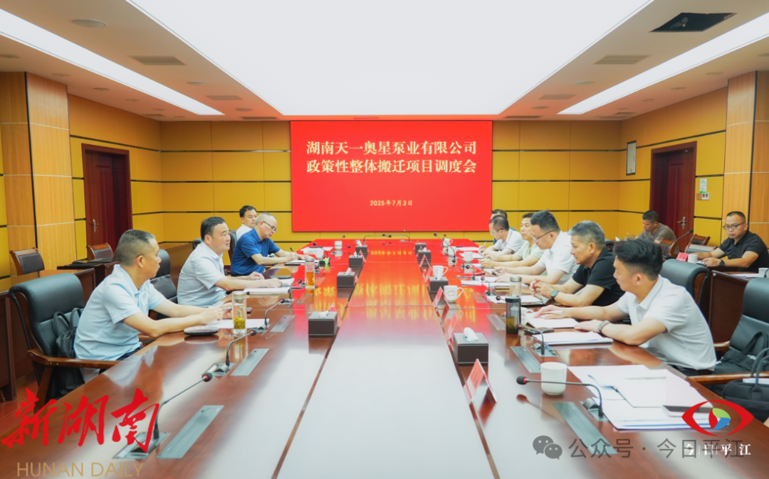 平江融媒7月4日讯(记者 雷怡慧)7月3日,县委书记刘正仁主持召开湖南天一奥星泵业有限公司 政策性 整体搬迁项目调度会,全面梳理当前工作推进情况,协调解决项目建设过程中存在的困难和问题。 县领导 熊江新、夏海、吴向前 参加会议。