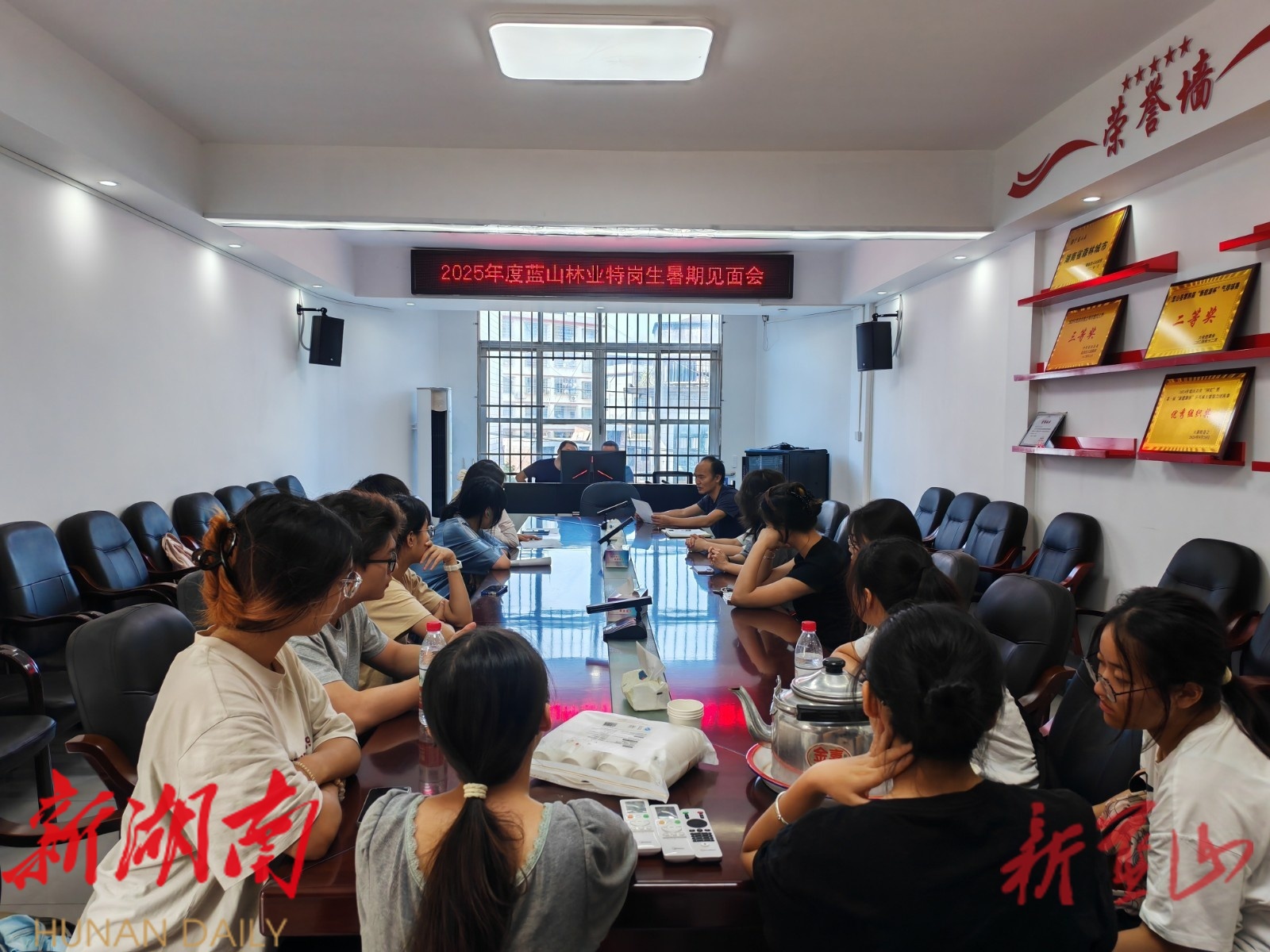 新蓝山客户端7月9日讯 (通讯员 刘芸 邓子真)7月7日,蓝山县林业局召开基层林业特岗生暑期实习见面会,来自省内高校的20名林业特岗生齐聚一堂,开启暑期实习征程。