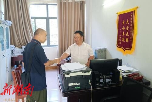 湖南日报·新湖南客户端7月9日讯(通讯员 梁锋)7月骄阳似火,一位特殊的访客步履蹒跚却满含热忱——永兴县鲤鱼塘镇的廖大爷顶着烈日,专程前往县民政局。刚踏入大厅,工作人员便快步迎上,紧紧握住老人的手,关切询问近况。这位视力二级残疾的老人,脸上绽放出幸福又感激的笑容,这一握一笑的瞬间,定格成了一幅干群同心的温暖画卷!