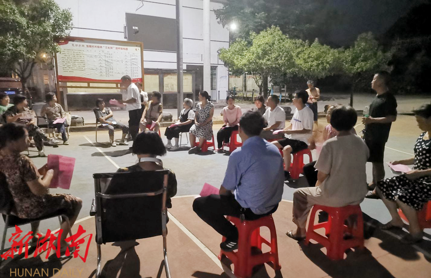 湖南日报·新湖南客户端7月9日讯(通讯员 刘书聪)7月8日傍晚,冷水江市金竹山镇恒星村的晒谷场上灯火通明,几十张竹椅围成一圈,一场别开生面的 “扫黄打非” 屋场会在这里热闹举行。