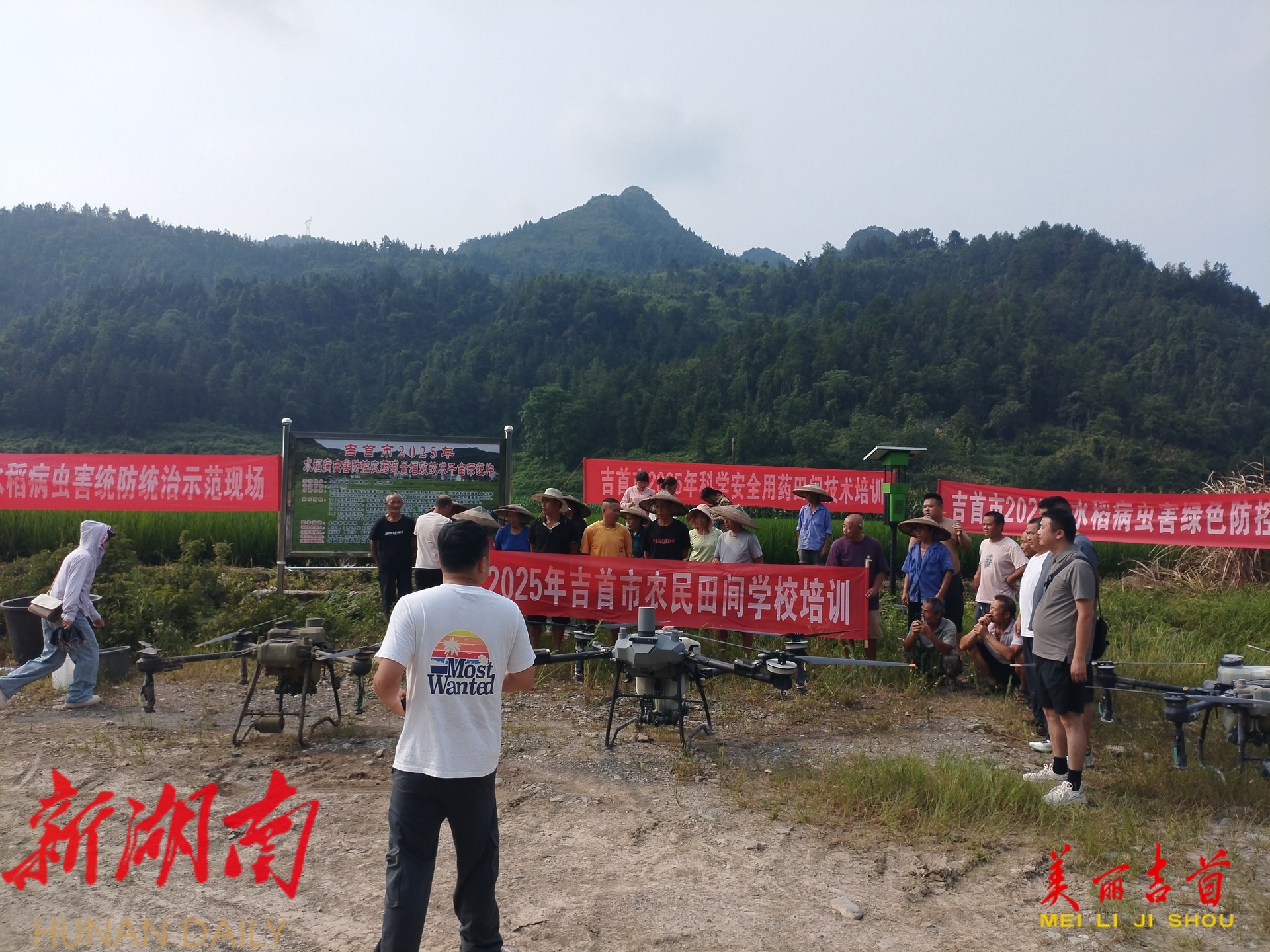 吉首市2025年水稻病虫害统防统治全面启动以来,市农业农村局技术人员深入田间地头,通过 面对面讲解 、 农技微信服务平台交流等方式 ,广泛发动群众加强水稻田间管理。 并对全市水稻种植基地适合无人机飞防区域进行病虫害统防统治,进一步确保我市粮食生产安全。