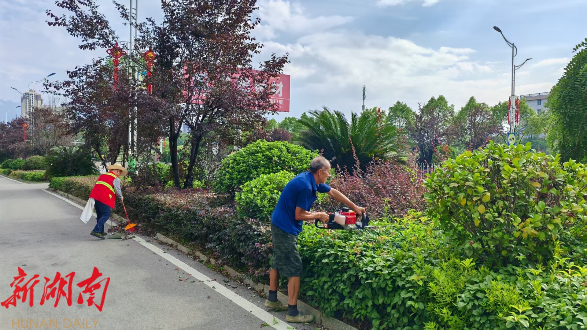 在蔡锷南路及平溪广场公园,园林绿化工人分工有序:有的蹲在绿化带里徒手拔除杂草,有的手持油锯将灌木丛修剪得平整洁净,还有的握着扫把及时清扫修剪下来的枝条。眼下正值绿化苗木生长旺季,工人们正集中力量对县城各主干道绿化带内的地被花卉、灌木及行道树进行修剪整形,补植缺失绿植,让绿化线条齐整、轮廓清晰,持续提升城区绿化 “颜值”。