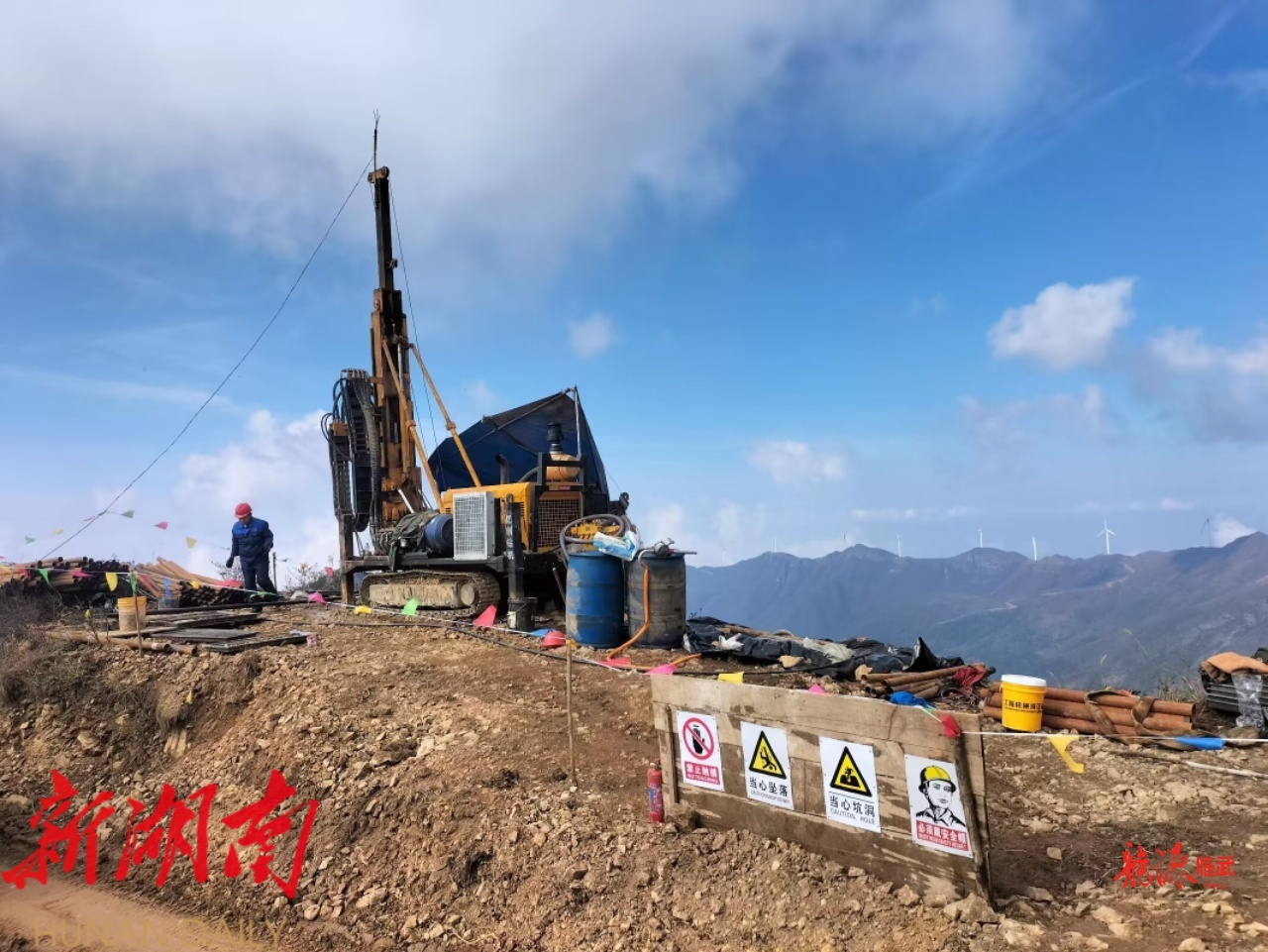 湖南省地质院矿调所鸡脚山项目负责人 陈志强介绍,挑战前所未有,传统修路运输根本行不通,设备上不来,他们采用大型无人机+高山索道组合吊运,单台钻机拆解成十几个部件,“空投”到预定位置,再进行重新组装,结合传统的修路搬运,光是钻探就打了9万多米。