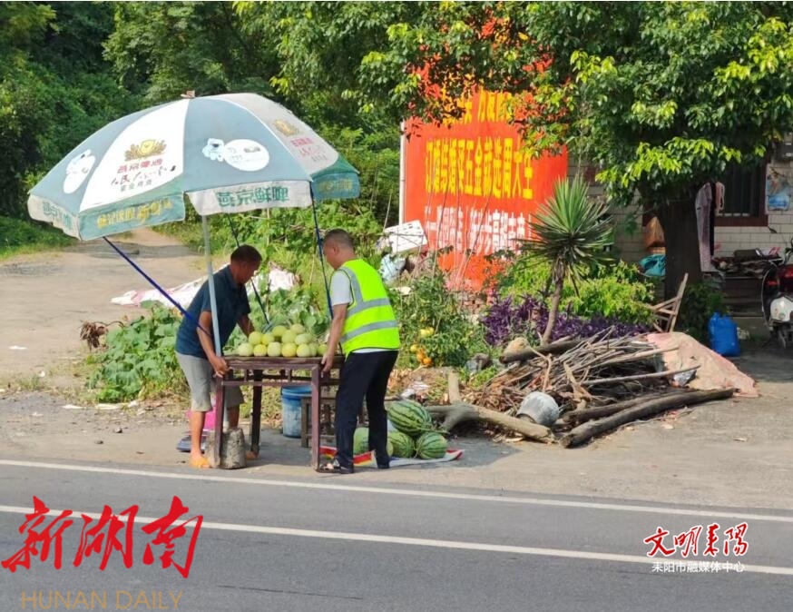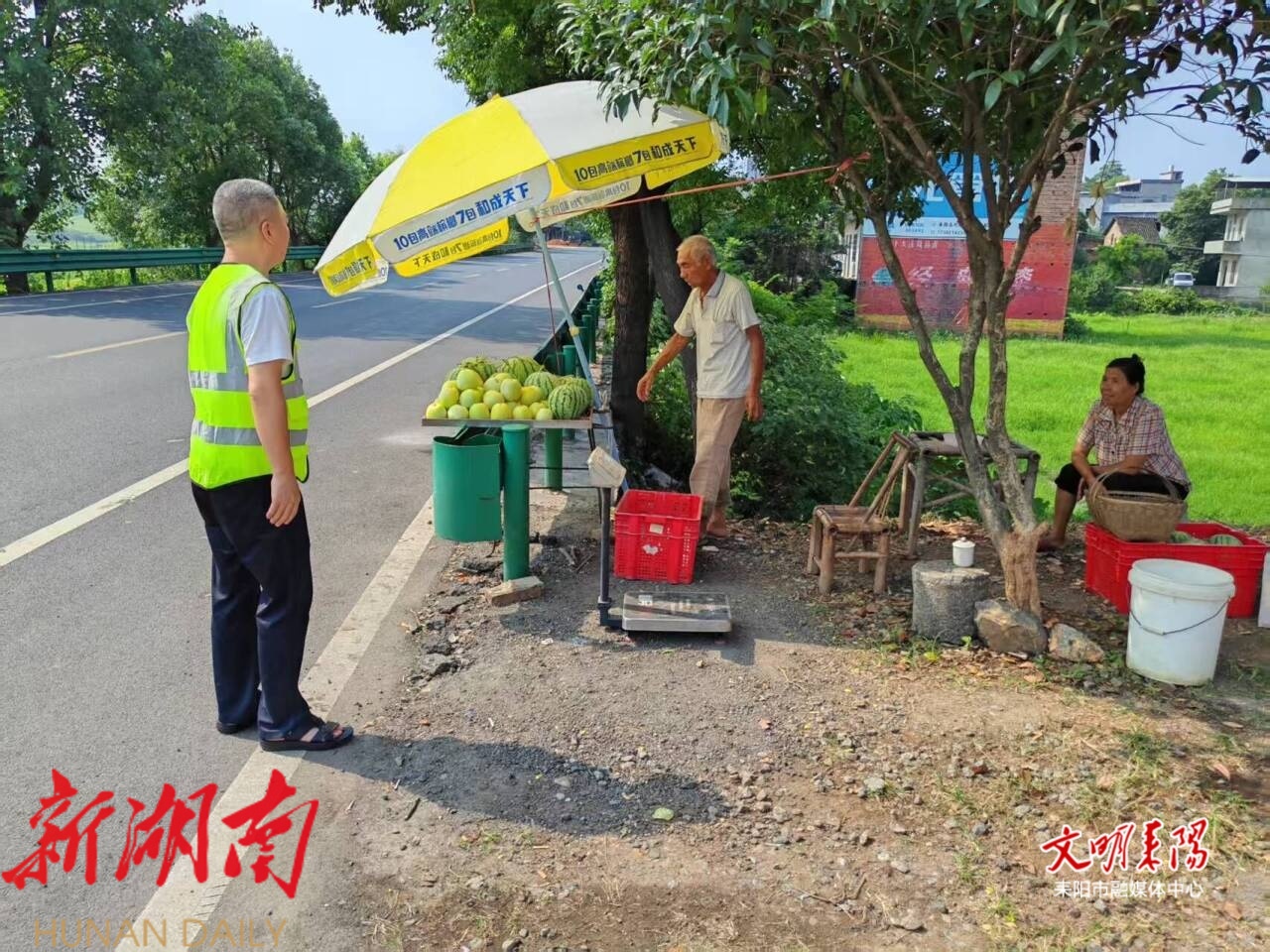 耒阳融媒7月10日讯(记者 江维东) 7月9日,骄阳似火,小水镇“两站两员”像往日一样,在107国道小水镇路段展开巡查工作。当巡查至一处弯道附近时,三个简易搭建的西瓜摊点赫然出现在眼前,几位瓜农正坐在遮阳伞下,向着过往车辆热情吆喝,售卖西瓜。