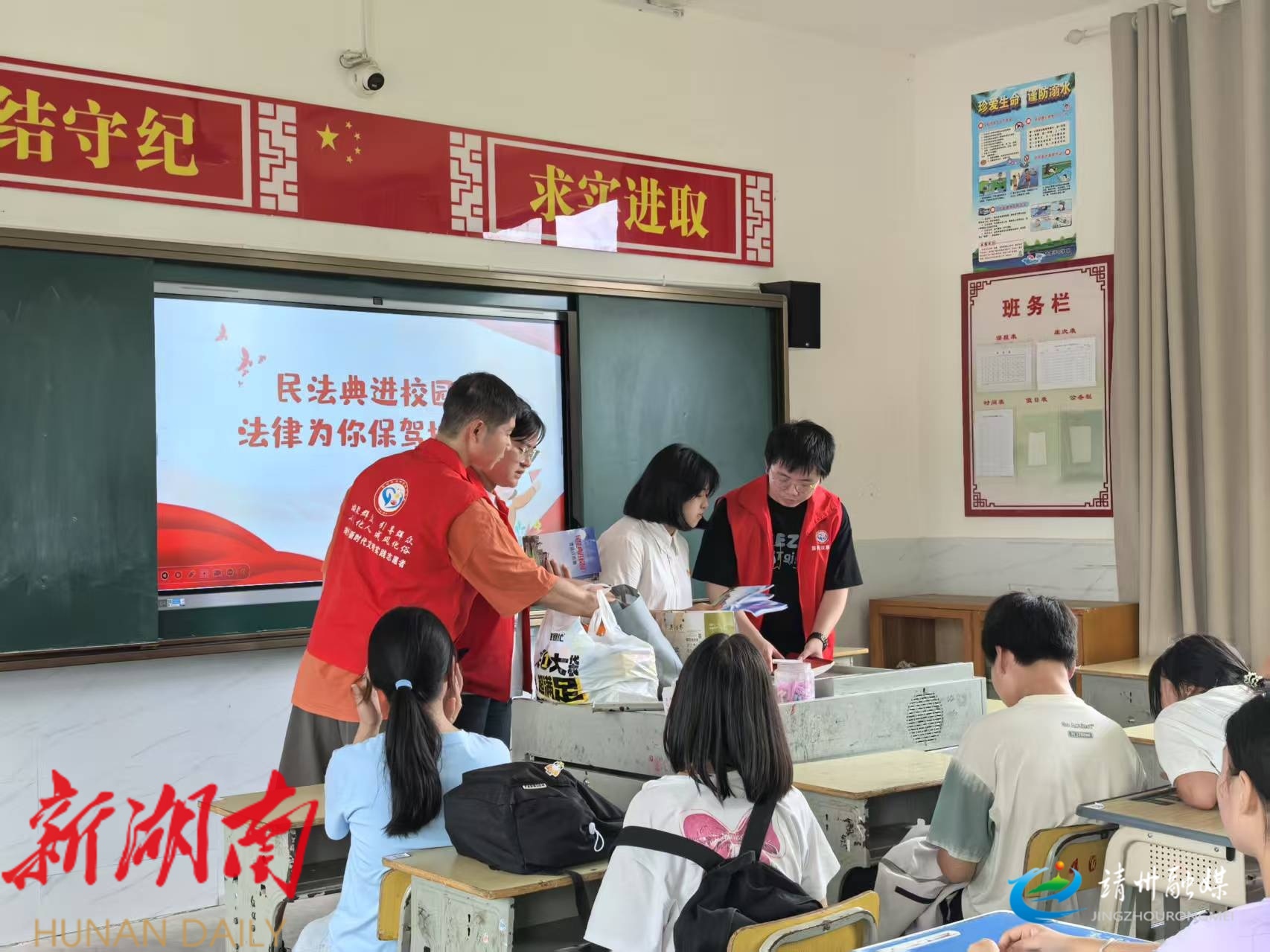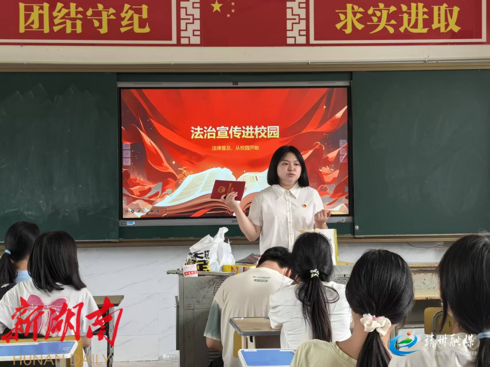 靖州融媒7月11日讯 (通讯员 龙琳) 7月9日,借学生领取通知书之际,靖州苗族侗族自治县大堡子镇综治中心联合镇司法所、派出所、文化站等部门,走进大堡子镇中学开展“法治宣传进校园”专题活动,为学生送上“暑期法治大礼包”。