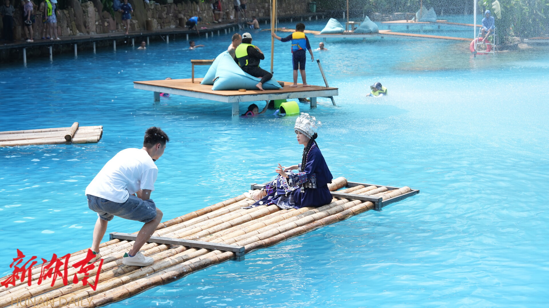 欢迎仪式后,嘉宾们随即踏上了桑植精品旅游线路之旅。第一站来到仙辰岛,芭蕉掩映,山风清凉。嘉宾们在这里筏竹、嬉水、休憩,在盛夏感受山间清凉。