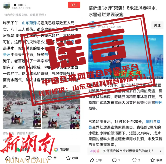真相: 7月11日,有个别自媒体账号发布信息称“昨天下午,山东菏泽龙卷风已经导致五人死亡,八十三人受伤”并配发相关图片,引发关注。经核实查证,菏泽市7月10日并未发生龙卷风,网传消息系谣言。此外,另一自媒体账号近日发布“临沂遭‘冰弹’突袭!8级狂风卷积水,冰雹砸烂果园设施”等信息。经向临沂市气象部门核实,近期临沂市未发生大风冰雹天气,上述信息与实际情况不符,确为谣言。请广大网民以气象部门发布的信息为准,勿轻信、勿传播非正规来源或未经证实的信息。(来源:山东省互联网违法和不良信息举报中心)