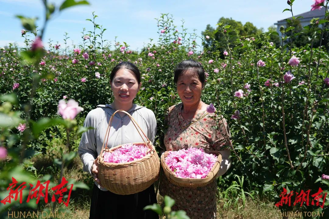 每天清晨,先锋桥村木槿示范种植基地热闹起来。20多位村民穿梭在花丛间,指尖轻触花茎,小心翼翼地采下带着晨露的花朵。“花瓣上的露水最能锁住浓郁的香气,采摘时力道要恰到好处。”村民戴姗毛边说边示范,一朵朵饱满的木槿花应声落入篮中。戴姗毛等村民,通过土地流转租金、入股分红、合作社务工等多种途径实现增收。先锋桥村便民服务员黄军介绍,“村里每天发往长沙、益阳城区的鲜木槿花2500多公斤。”