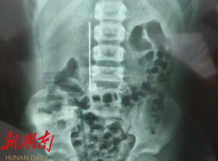 湖南日报·新湖南客户端7月14日讯(通讯员 代欢 邓燕芳)6月28日晚,永兴县人民医院上演了一场惊心动魄的生命救援。一名9岁男童因误吞9厘米长缝被针,出现腹痛症状紧急送医。经CT检查显示,这根缝被针已刺入男童胃壁,若不及时取出,随时可能引发大出血、胃肠穿孔,甚至伤及邻近器官或腹腔大血管,威胁生命安全。