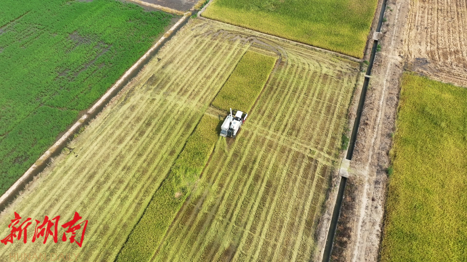 在湘阴县鹤龙湖镇,金黄色的稻田绵延起伏,收割机在田间穿梭作业。收割机尾部,粉碎装置高速旋转,喷吐出细碎的秸秆粉末,均匀地铺撒在收割后的田地上。
