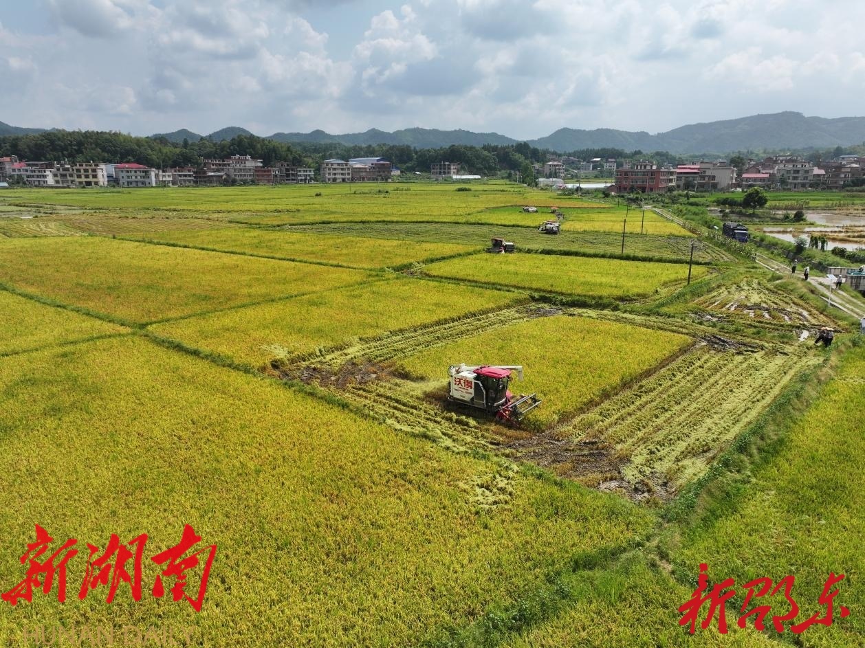 在邵东市省级粮食生产万亩综合示范片,沉甸甸的稻穗压弯枝头,微风吹过,金黄稻浪层层翻涌,勾勒出一幅生动的丰收画卷。