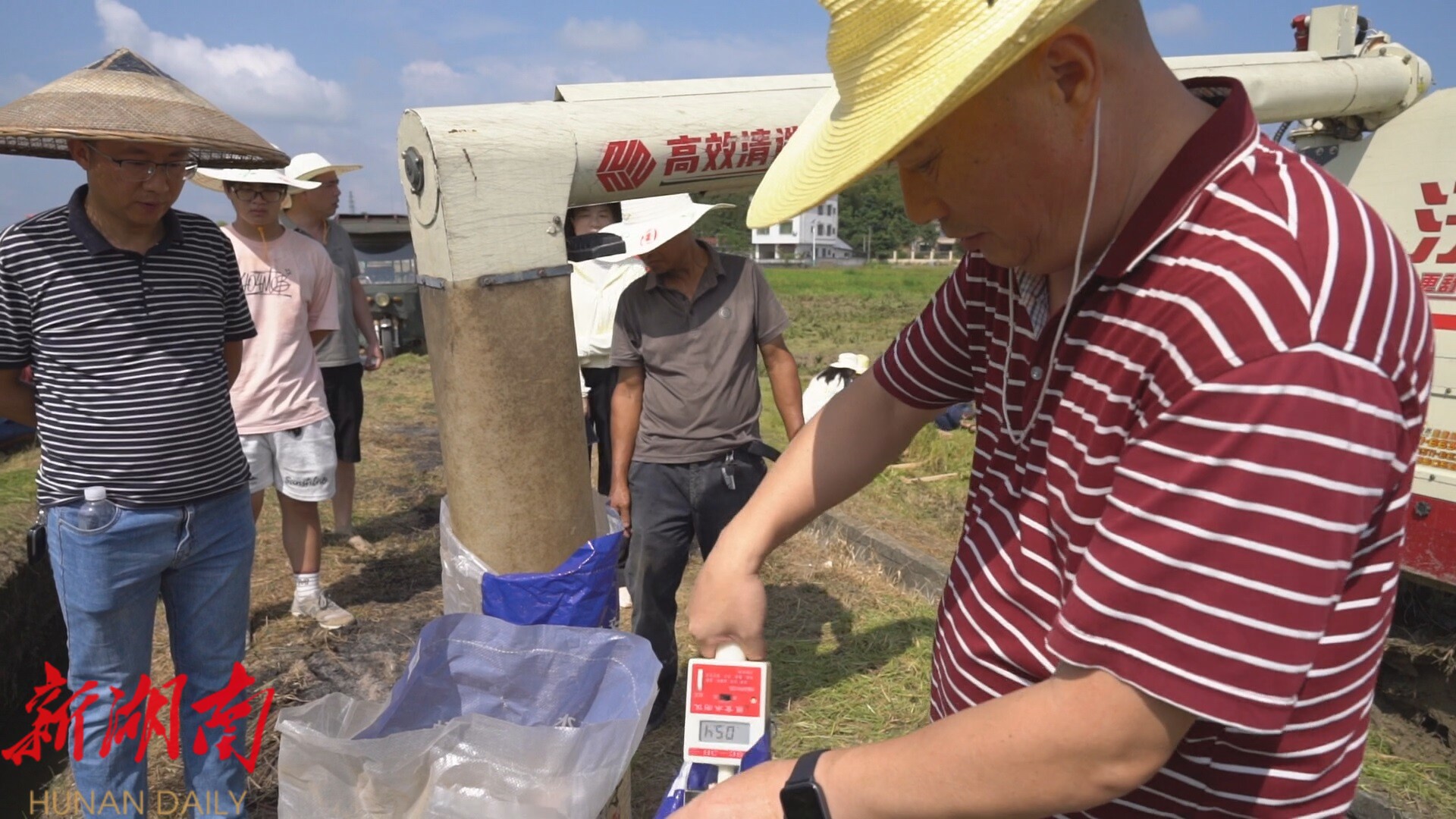 测产现场,收割机的轰鸣声此起彼伏,饱满的稻穗被高效地收割、脱粒、入仓。由省单产提升专家指导组、国家统计局洞口调查队、县农业农村局等单位组成的测产组严格按照测产流程,认真测面积、测水分、称重量,细致计算亩产,确保实测数据的真实性和准确性。经测算,“瑞两优1053”在测试田中的亩产最高达到了634公斤,展现出了良好的丰产潜力。