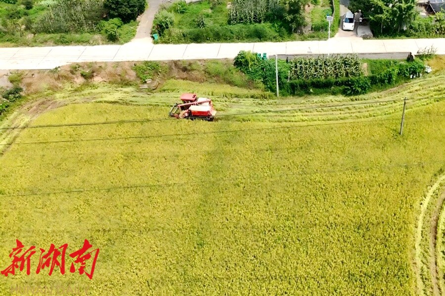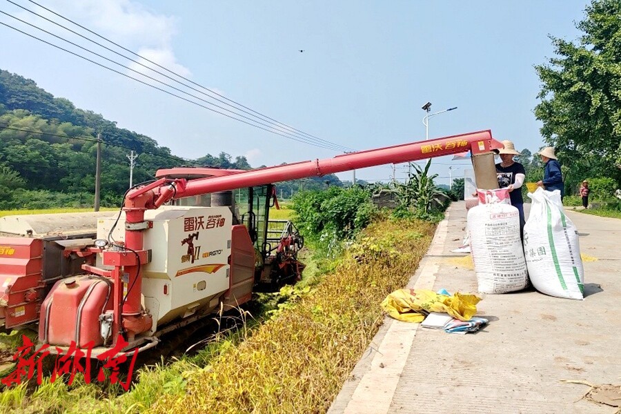 走进东岳殿村双季稻示范片,金黄的稻浪随风涌动,饱满低垂的稻穗彰显着丰收的喜悦。联收割机穿梭其间,轰鸣声不绝于耳,稻穗被快速卷入机器,经过脱粒处理,一袋袋金灿灿的稻谷不断产出。种粮大户李之国擦了擦额头的汗水,满脸笑意地说道:“今年早稻长得好哇,平均亩产湿谷能有1300斤嘞!这一袋袋粮食,就是咱辛苦半年最好的回报。”话语中满是丰收的自豪,也代表了众多农户的心声。