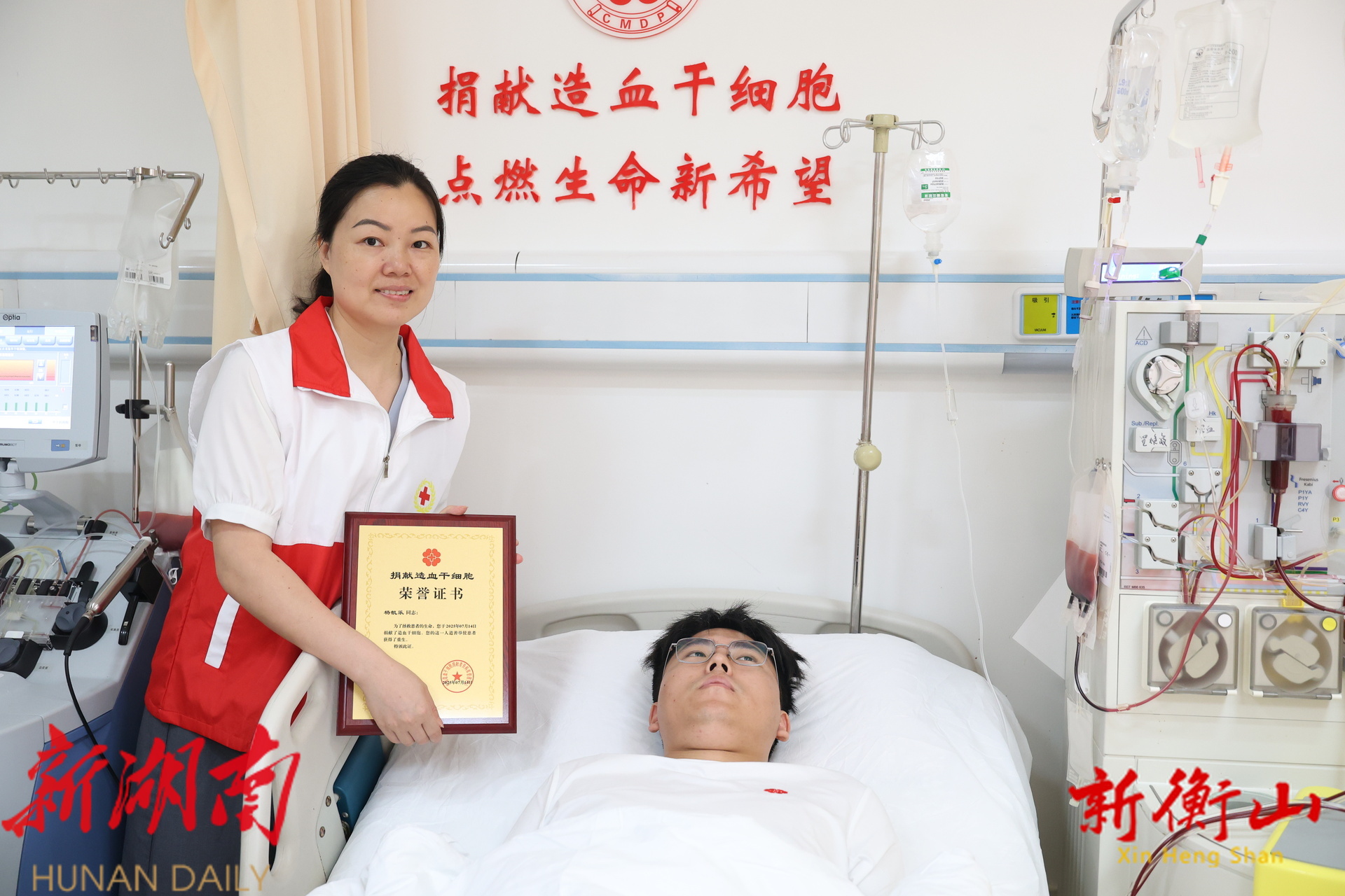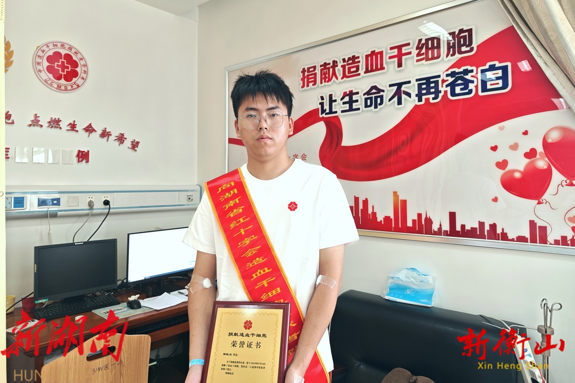新衡山客户端7月15日讯(记者:廖晶 文雅婷 通讯员:胡新芝)暑假期间,衡山县一位“00 后 ”青年教师杨凯乐选择了一种特别的方式度过假期。他走进医院,接受动员剂注射,成功捐献252毫升造血干细胞混悬液,用行动诠释了新时代青年的责任担当,成为全国第20559例、湖南省第1363例、衡阳市第51例、衡山县第3例造血干细胞捐献者。