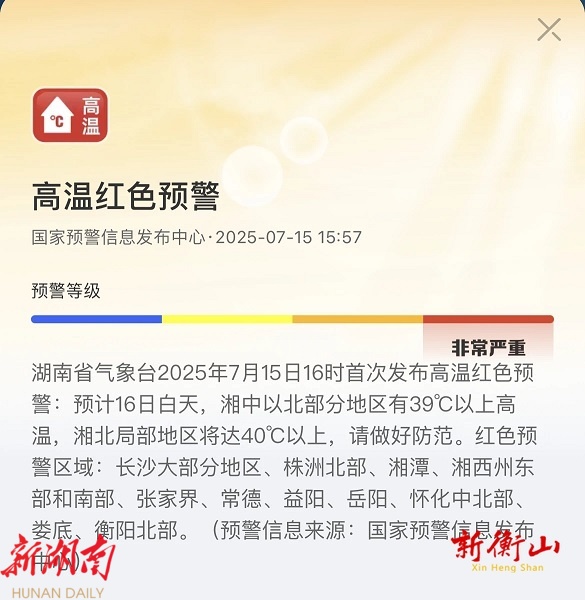 新衡山客户端7月15日讯(记者:蒋鹏 旷雨澄)7月15日16时,湖南省气象台发布2025年首个高温红色预警: 预计16日白天,湘中以北部分地区有39℃以上高温,湘北局部地区将达40℃以上,请做好防范。 红色预警区域:长沙大部分地区、株洲北部、湘潭、湘西州东部和南部、张家界、常德、益阳、岳阳、怀化中北部、娄底、衡阳北部。