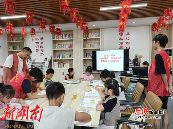 岳塘融媒7月15日讯 (通讯员:许婷)近日,在岳塘区霞城街道阳塘村图书馆内,孩子们正专注书写作业。大学生志愿者们发挥专业特长,对孩子们在语文、数学等学科的薄弱环节进行细致辅导,帮助他们巩固知识基础,培养学习主动性,养成良好的学习习惯。休息时间,孩子们可以在活动室阅读课外书籍、玩转各种益智玩具,也能到室外使用健身器材锻炼身体。