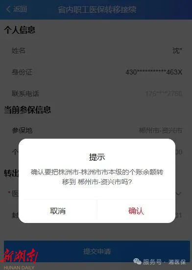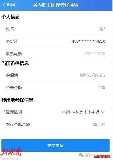 三湘都市报·新湖南客户端7 月15 日讯(文/ 视频 全媒体记者 高煜棋 通讯员 乔木 高杰 熊定波)近日,因工作变动在长沙新参保的李先生惊讶地发现,单位刚帮他完成参保登记,原株洲个人账户上500 多元就立刻到账了。同日,已在郴州参保的刘女士通过“湘医保”提交省内转移接续申请后,其省本级个人账户1500 余元竟然瞬间到账。