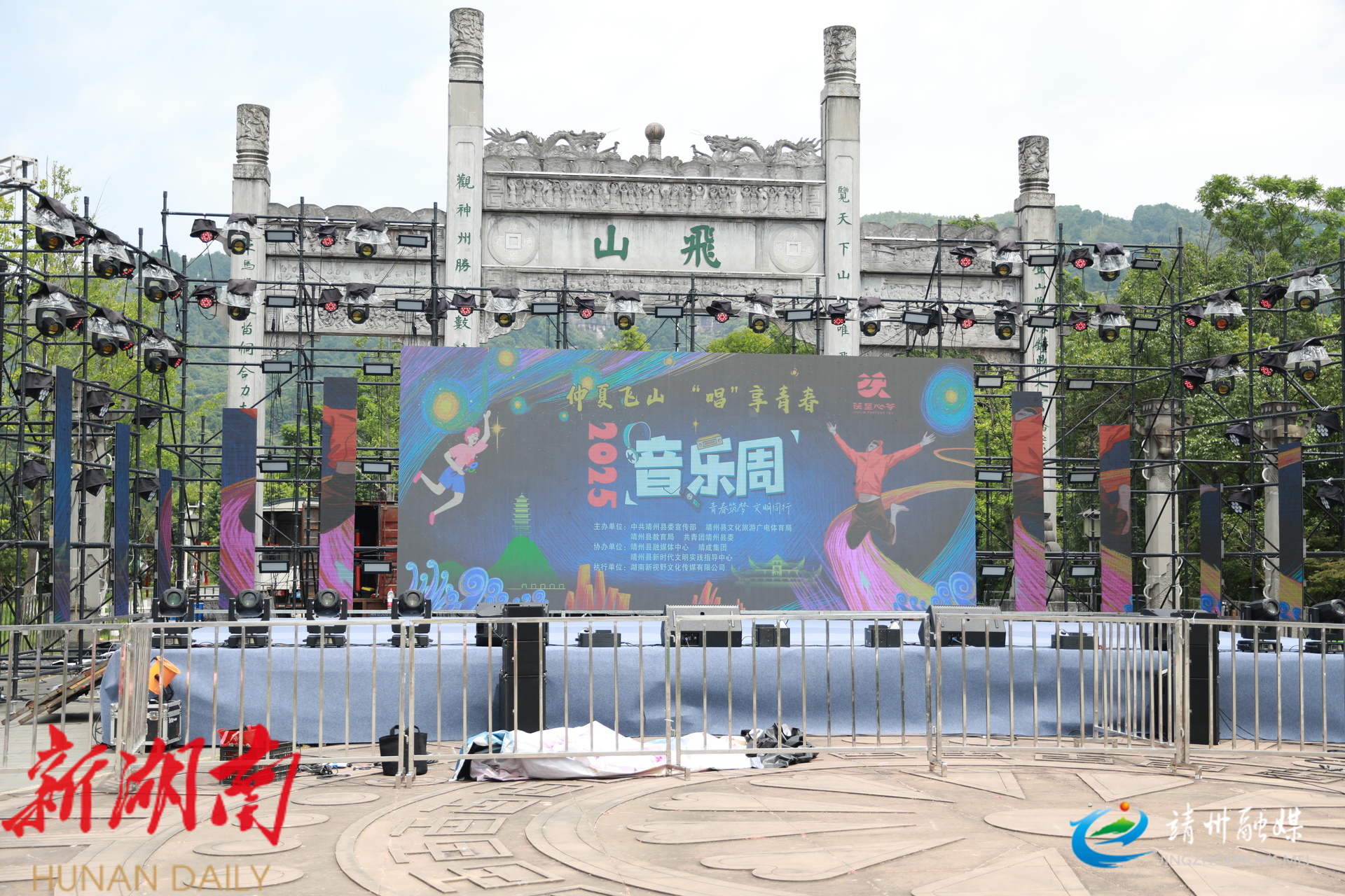 靖州“仲夏飞山·唱‘享’青春”音乐周舞台搭建收尾 五大主题演出明晚开唱