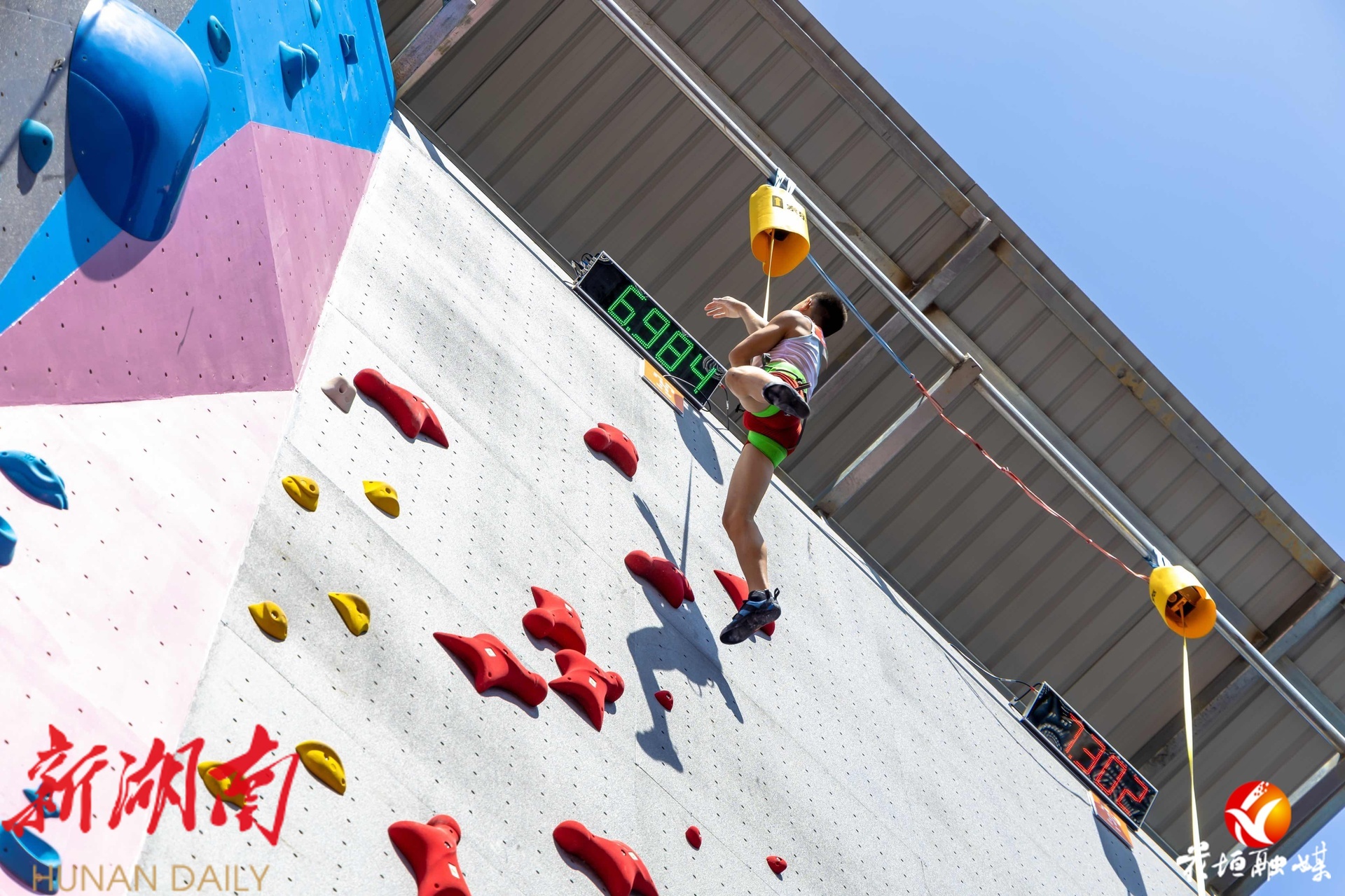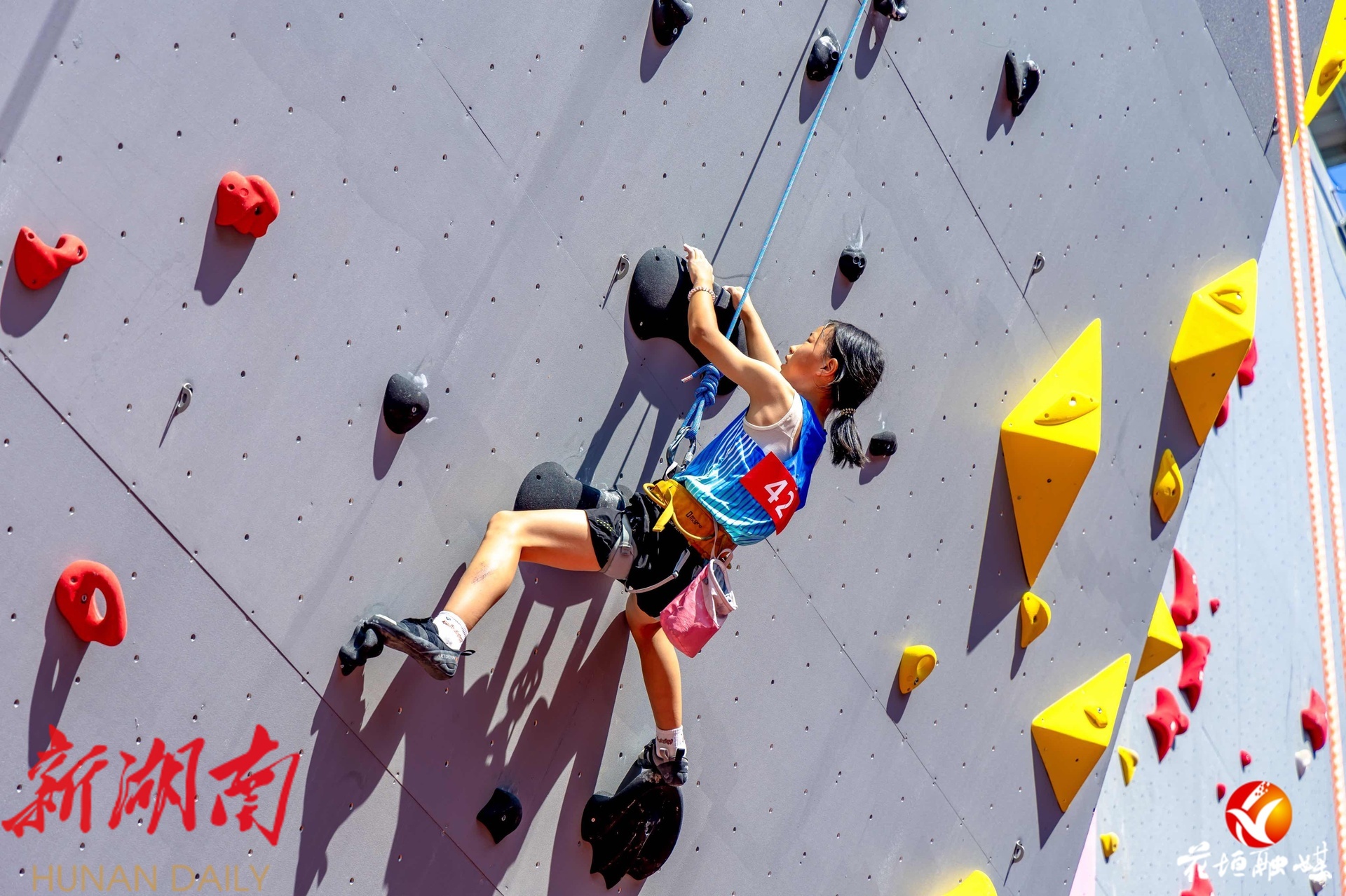 比赛首日,选手们在岩壁上展开精彩较量。他们灵活运用攀岩技巧,精准把握每一个岩点,动作协调而稳健。现场保护人员专业操作确保安全,观众们的加油助威声此起彼伏,充分展现了青少年蓬勃向上的精神风貌。