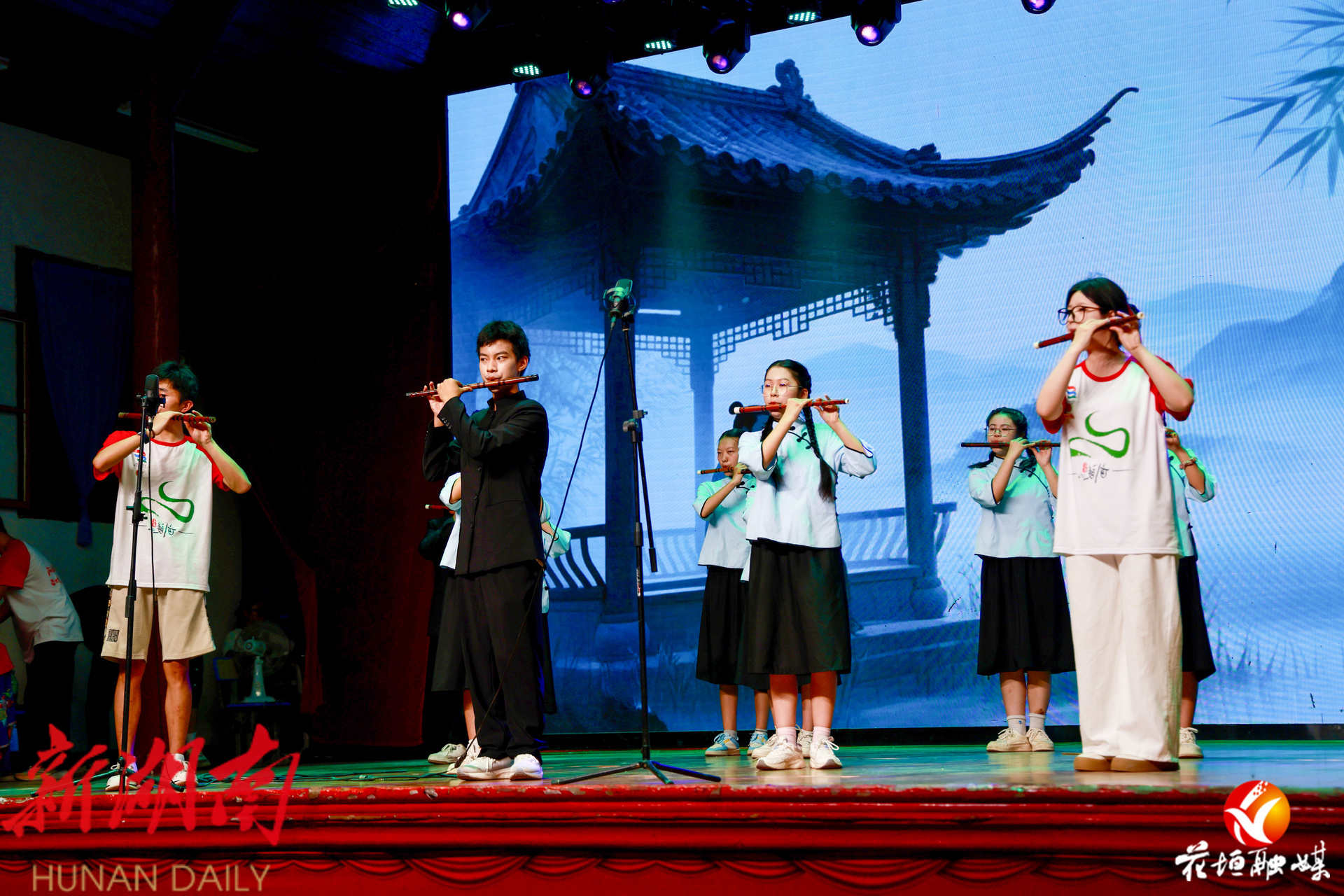 本次汇报演出由三中学子与吉首大学志愿者共同呈现,16个精彩节目涵盖苗族文化传承、现代艺术展示与科技创新实践三大主题。开场节目《迎宾鼓》以激昂的鼓点点燃全场热情,随后舞蹈《最炫民族风》、合唱《意在花》等节目充分展现了学生们的艺术风采。