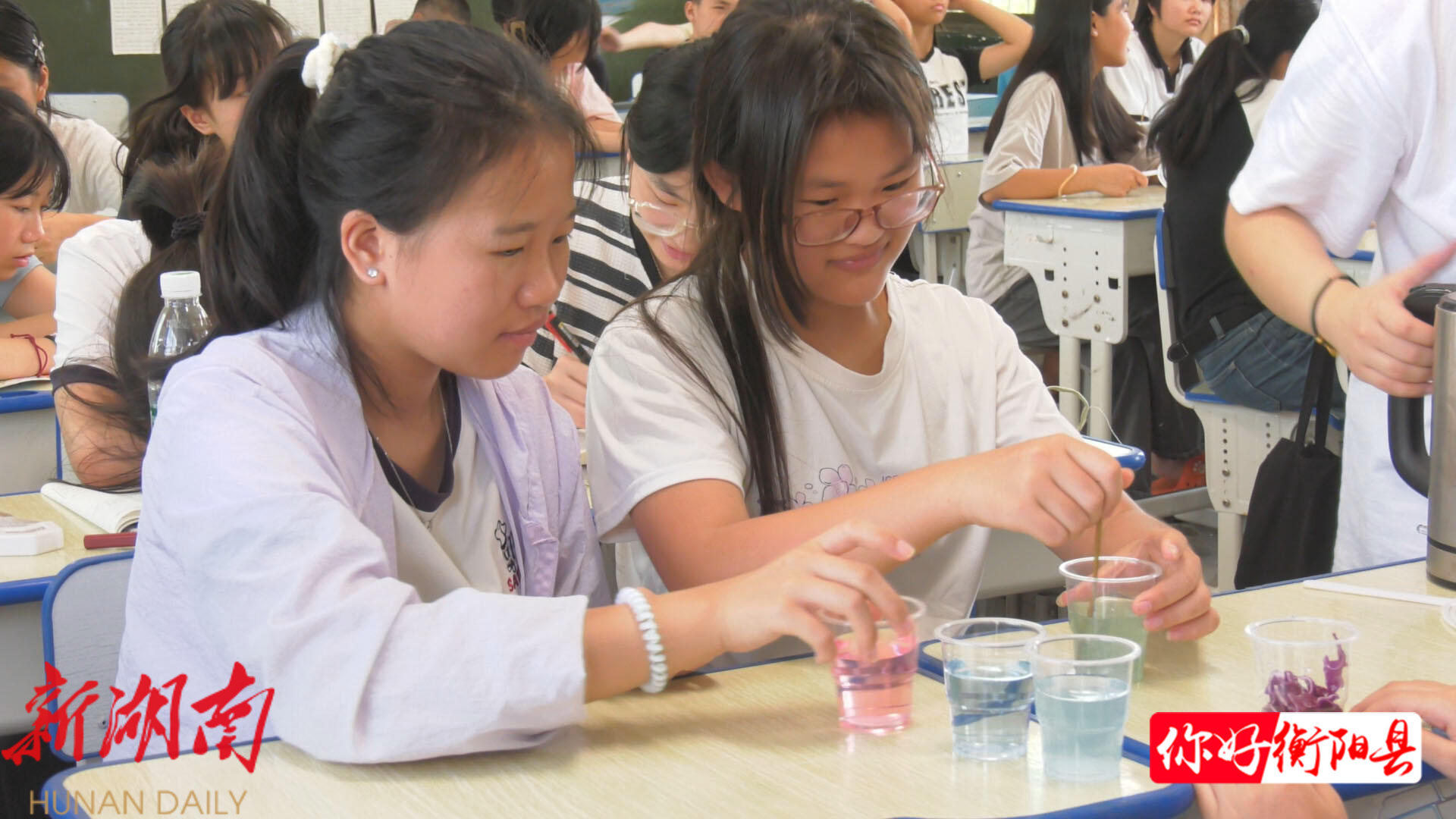 在三湖中学,湖南师范大学的大学生志愿者正带领孩子们探索紫甘蓝溶液变色的奥秘。深紫色的溶液被分装在多个烧杯中,志愿者先进行示范,将苏打水等液体逐一滴入溶液,原本单一的深紫色瞬间变成红、粉、绿、蓝等颜色。接着孩子们在老师的指导下,小心操作,将不同液体滴入自己的杯中,随着液体交融,缤纷色彩在杯中绽放,孩子们看着眼前的奇妙变化,目光里满是专注与兴奋。这堂沉浸式的实课,让孩子们在亲手操作中感受化学世界的趣味,悄然拓宽了认知视野。