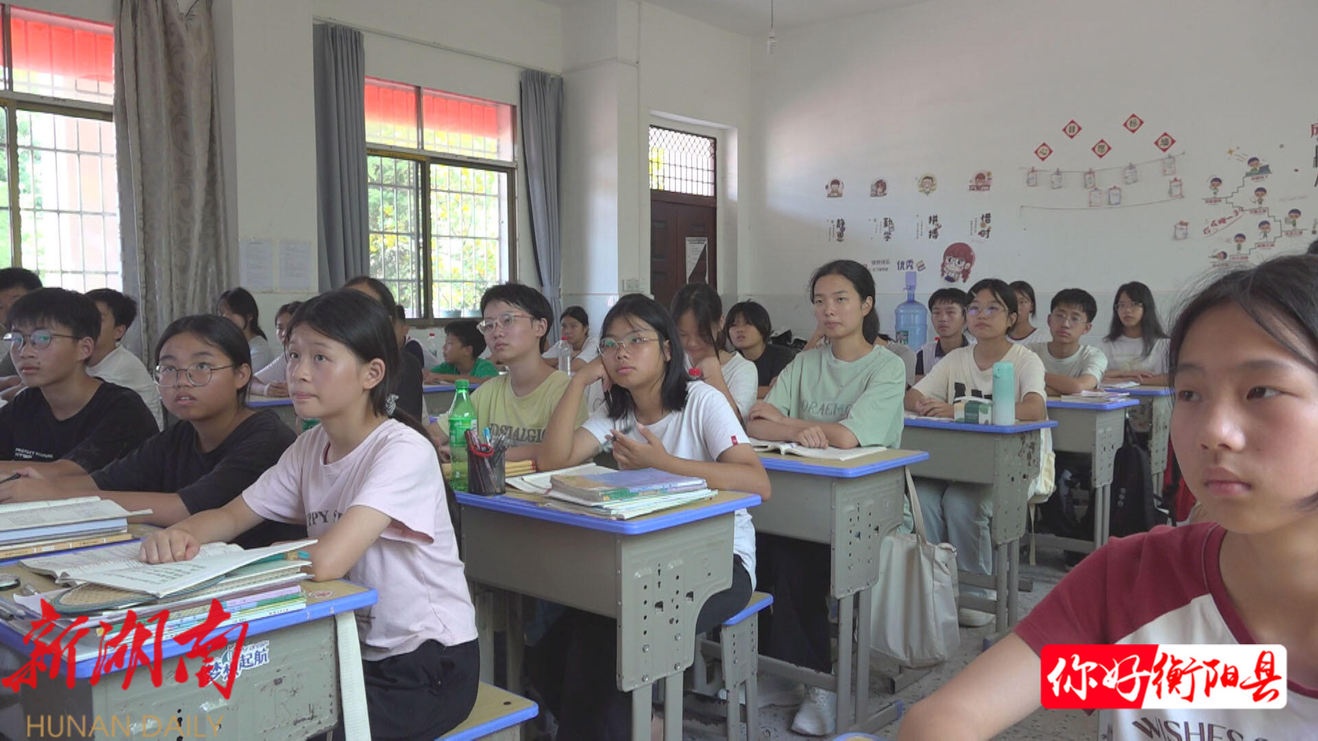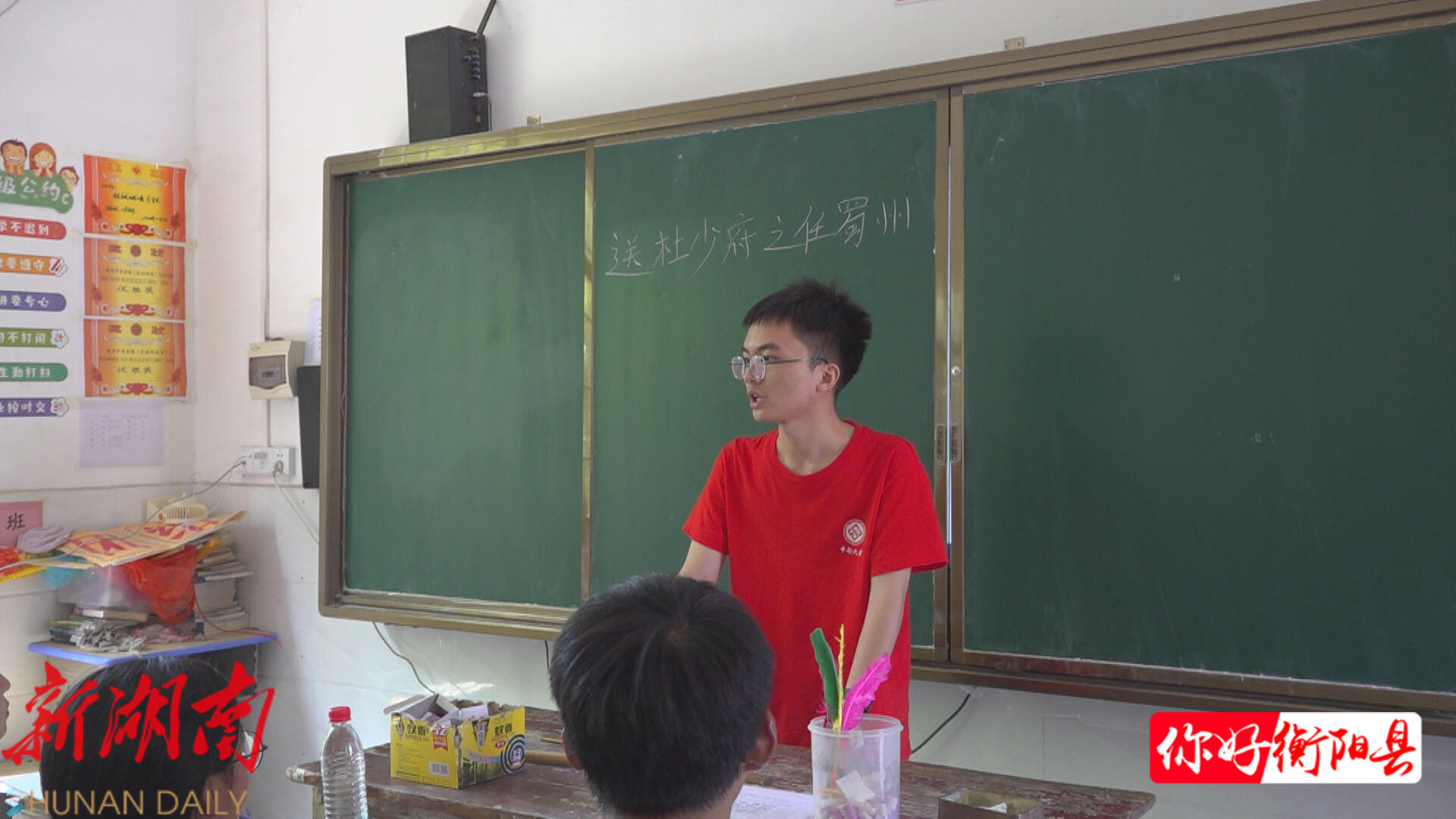 在 井头镇清潭中学的古 诗词 赏析课上,中南大学“三下乡”团队志愿者邓定正带领学生们品味诗词之美 。邓定是土生土长的衡阳人,今年6月,在得知学校将招募暑期志愿者前往衡阳县支教后,他第一时间报了名,身为文学类专业的他还提前精心准备了多门文学课程,希望通过文学的力量,为乡村学子打开一扇看世界的窗,让文字滋养他们的心灵成长。