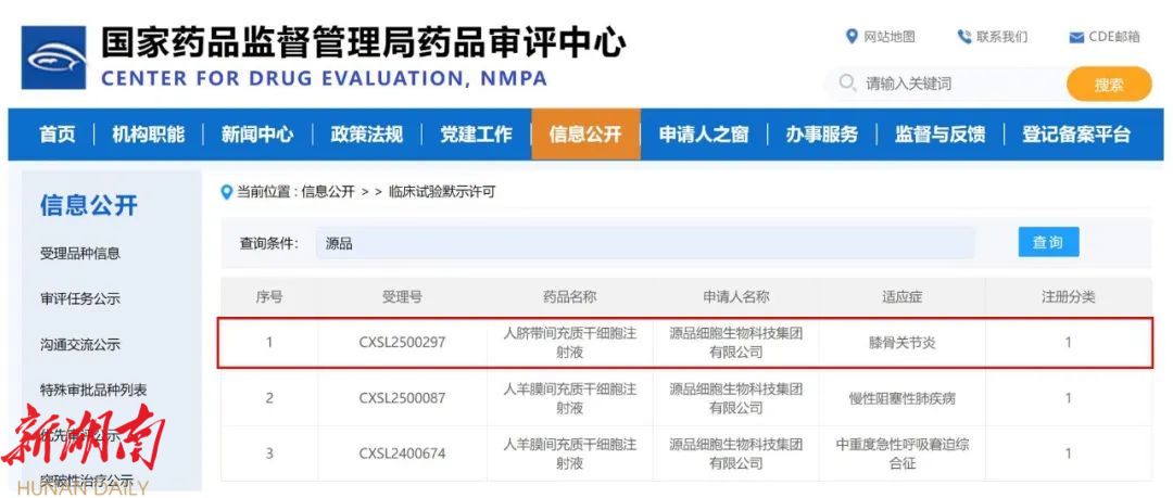 湖南日报·新湖南客户端7月17日讯(长沙经开区工作站记者 陈琪)2025年7月9日,国家药品监督管理局批准源品细胞生物科技集团有限公司(以下简称“源品生物”)的1类生物制品“人脐带间充质干细胞注射液”新药临床试验申请(IND),适应症为膝骨关节炎(KOA),该品种采用的是领先型的3D工艺,为源品生物与同济大学附属东方医院联合开发。这是该企业继“人羊膜间充质干细胞注射液”IND获批后,在干细胞创新药领域取得的第3个临床批件。